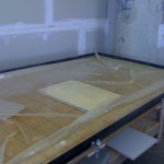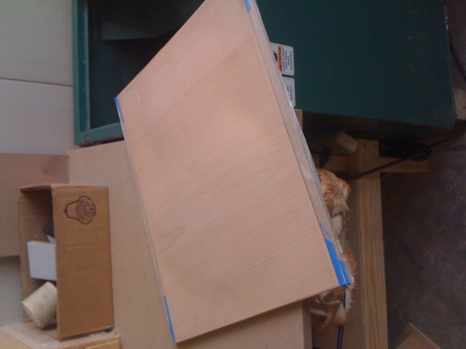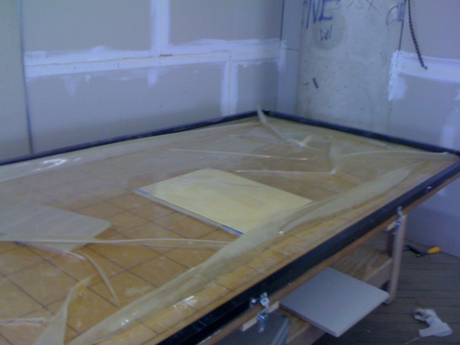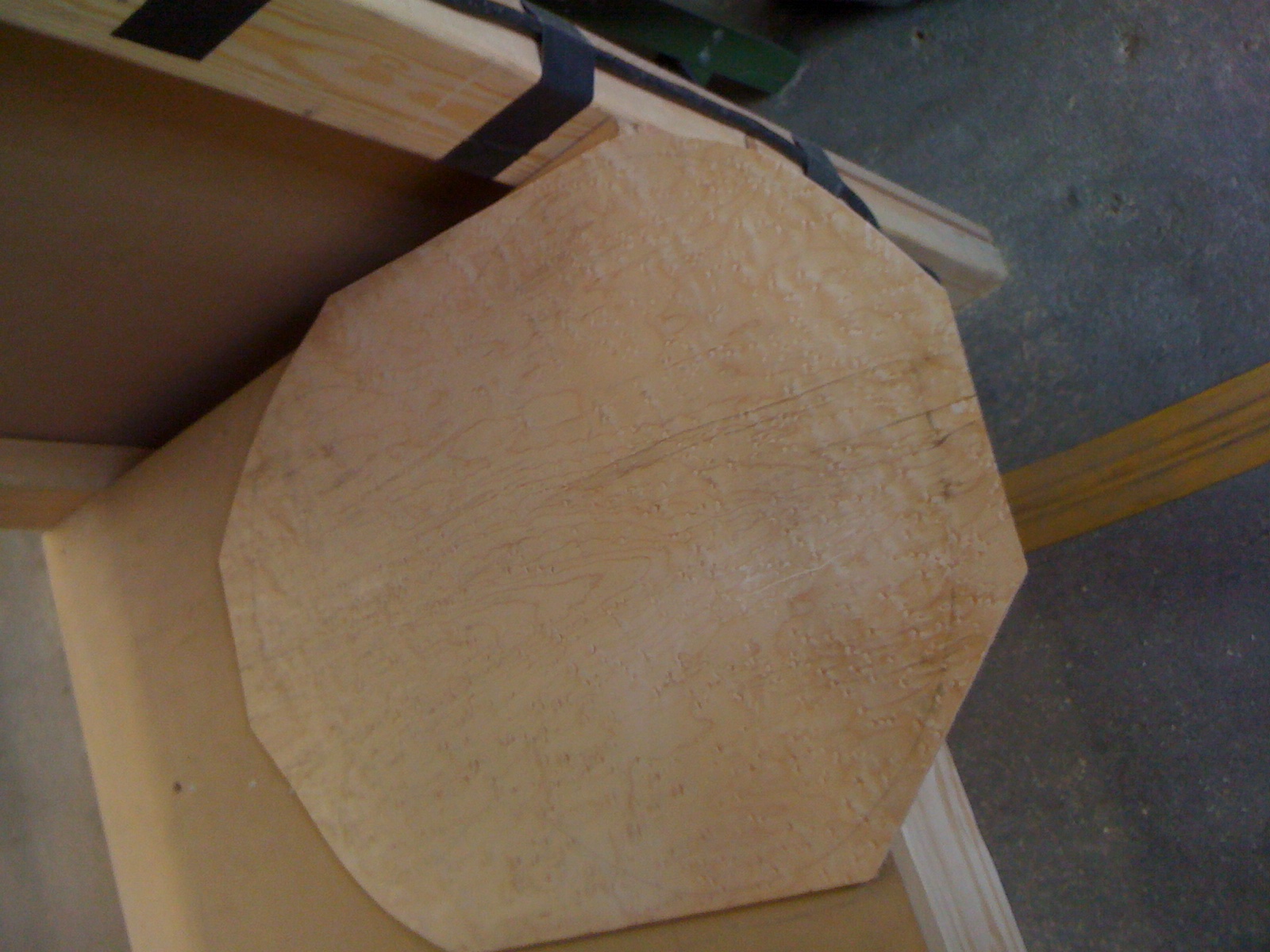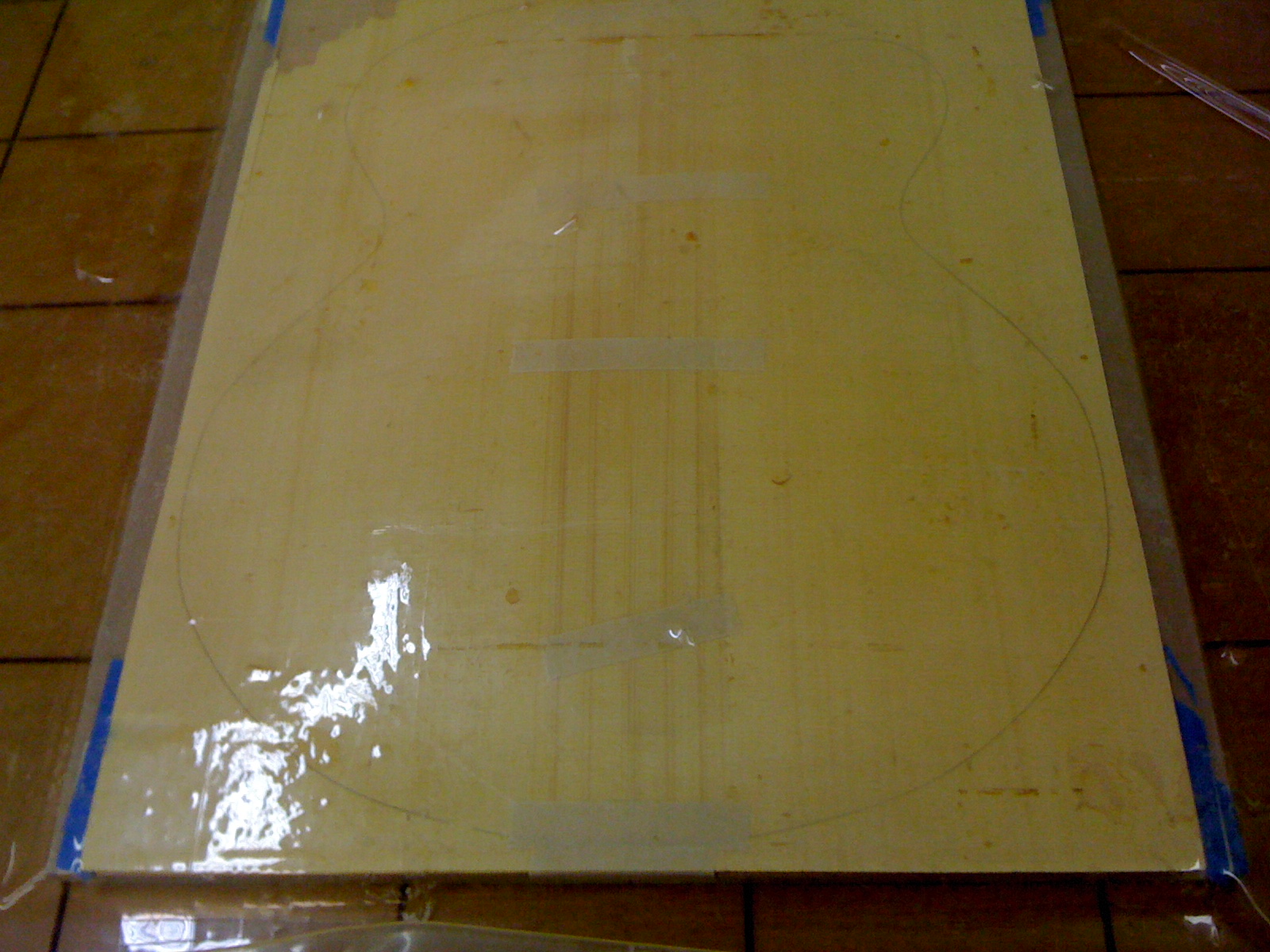 In a recent post i mention i made a laminate model for Bill at Legato. The plates i used for that project were pressed for me by Steve Holst. Nice plates, and the guitar really turned my head in how nice it sounded. But i wasnt entirely happy with the arch. So I decided to design and machine my own arch vacuum form in order to be able to laminate soundboard and back plates just how i like ’em. This guitar will feature 6 layer plates. The cabinet guys here at the new shop have a cool vacuum table, and i used it to veneer my first set of new plates here in house. Worked like a charm! Both plates are made of birch and veneered with alternating grain direction per layer. The back has a nice birdseye outer shell, the soundboard has a bookmatched spruce shell (I bandsawed and prepared my own spruce veneer here at the shop!).