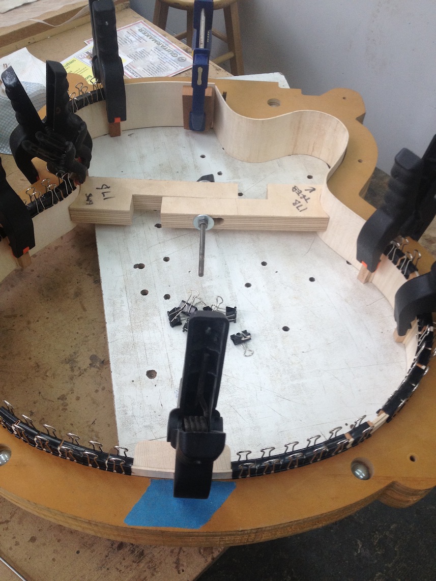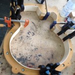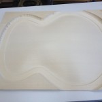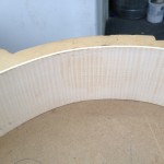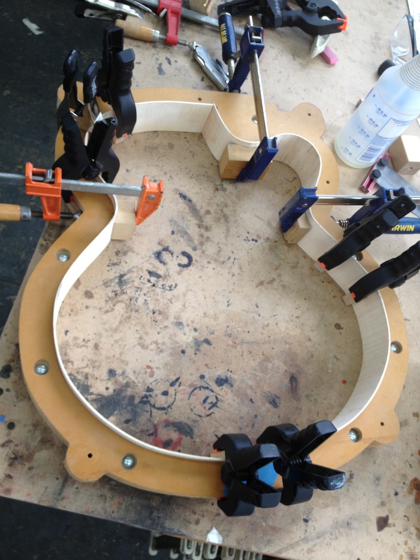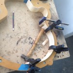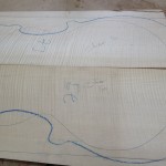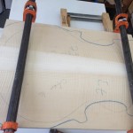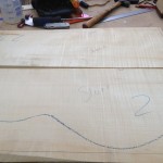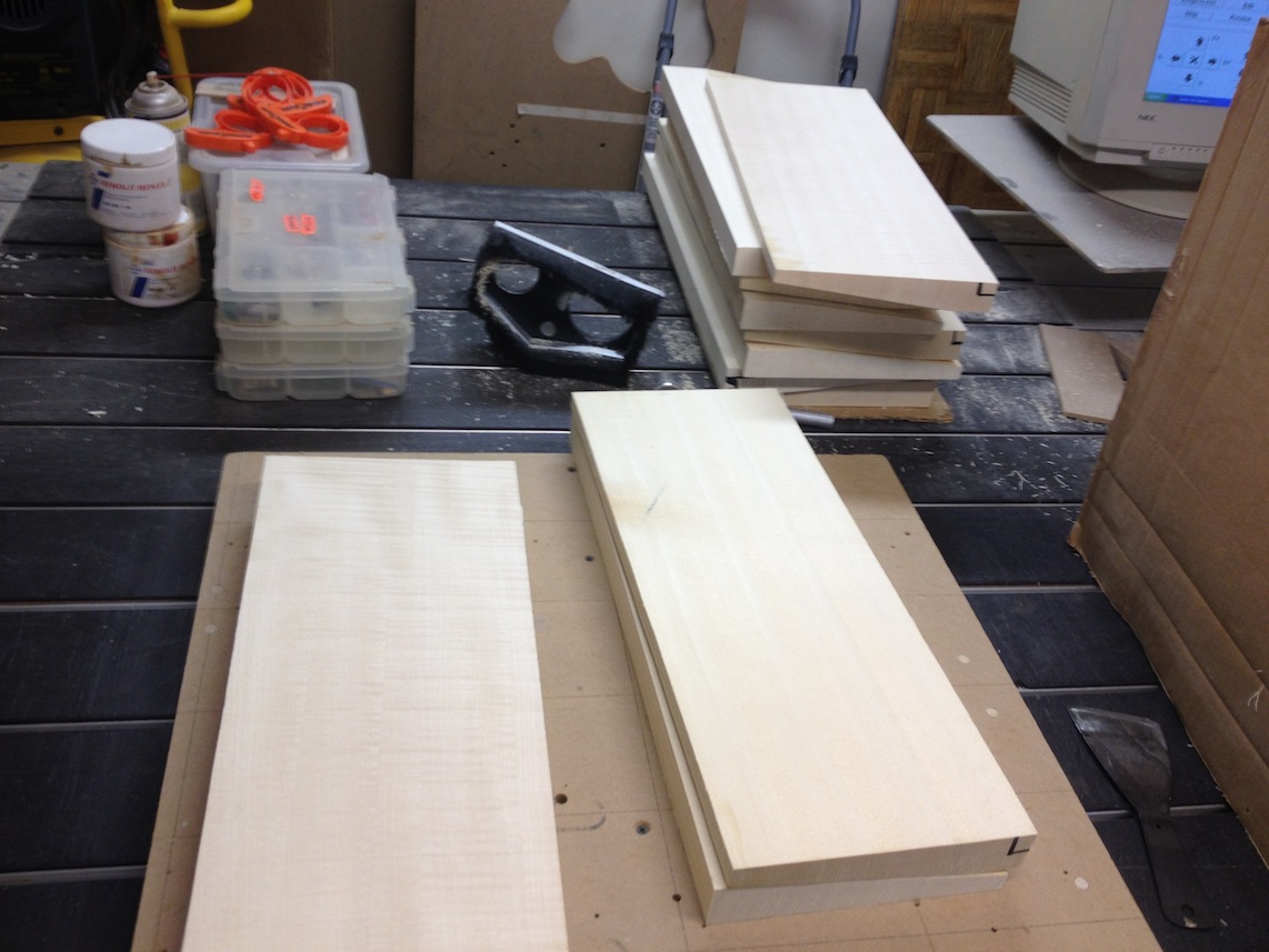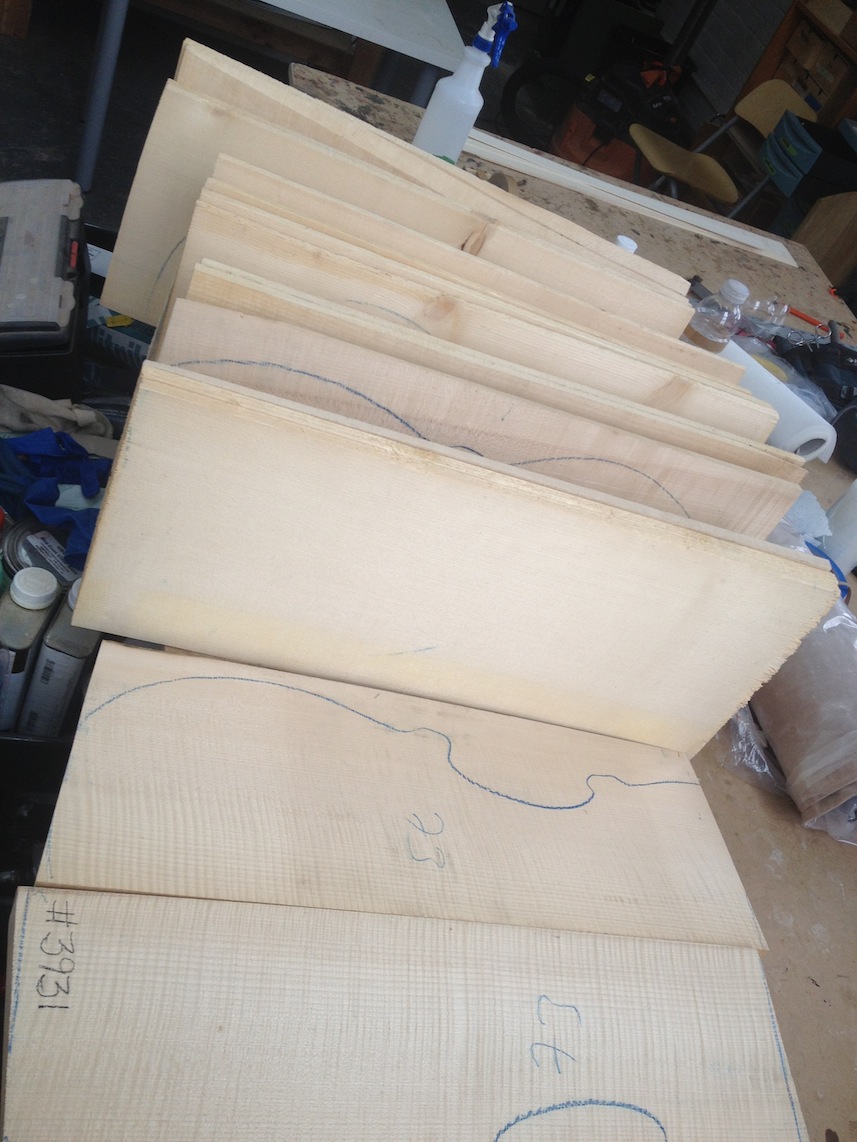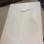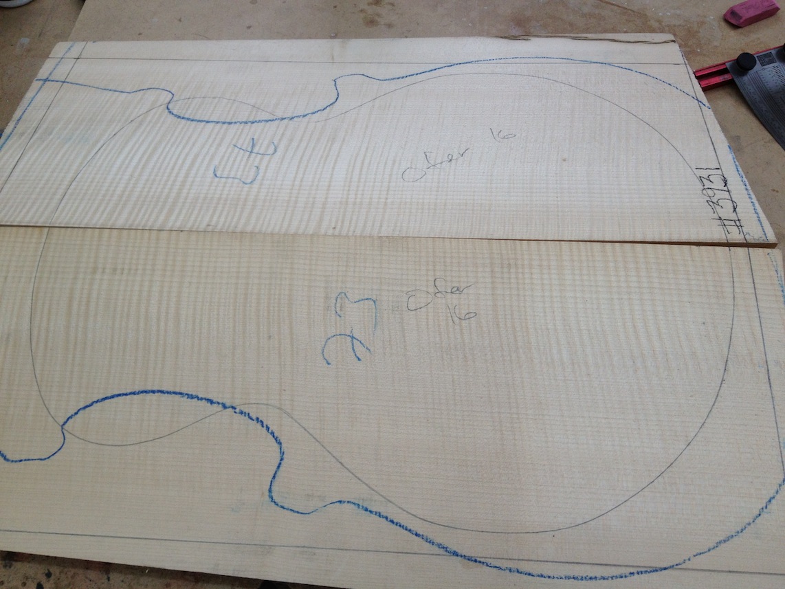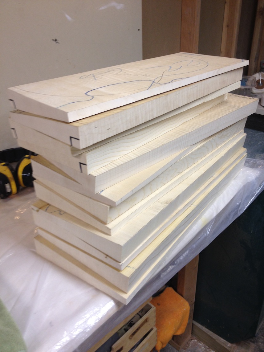 My other guitars in progress are in Patrick’s hands at the moment for clear coats, he’s doing great-they are turning out fantastic (see below). So in the interim i put some time in on the roughing work on my next guitars. Some interesting stuff here- A thinline model 15 for Donato Soviero, a Model 16 for Ofer Shalmon and a BIG model 18 Super 400 size guitar for Jonathan Slone. Ive been working on a lot of smaller 14″ guitars recently so doing a monster 18″ guitar is a real change of pace and super fun. Donato’s guitar will have an earthy finish like my other projects. Ofer’s will have an amber burst and the big 18 will have a decked out D’Angelico vibe. All great looking european cello woods throughout, the 16 and 18 will have full maple binding. Smokin!! Can NOT wait to play em.