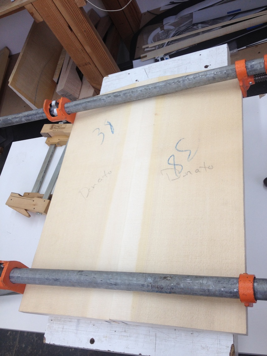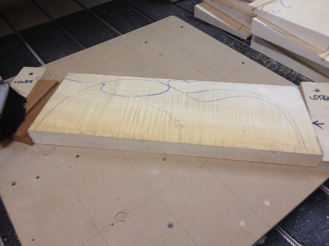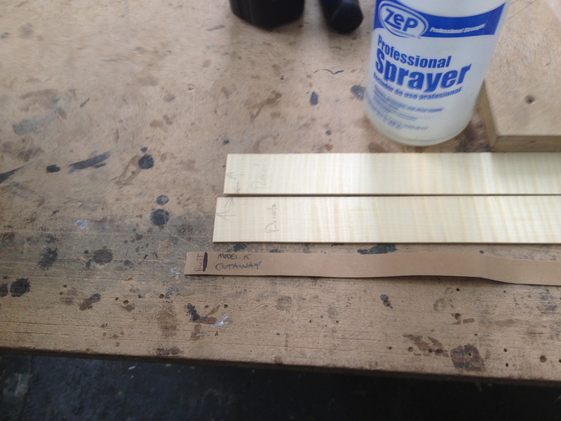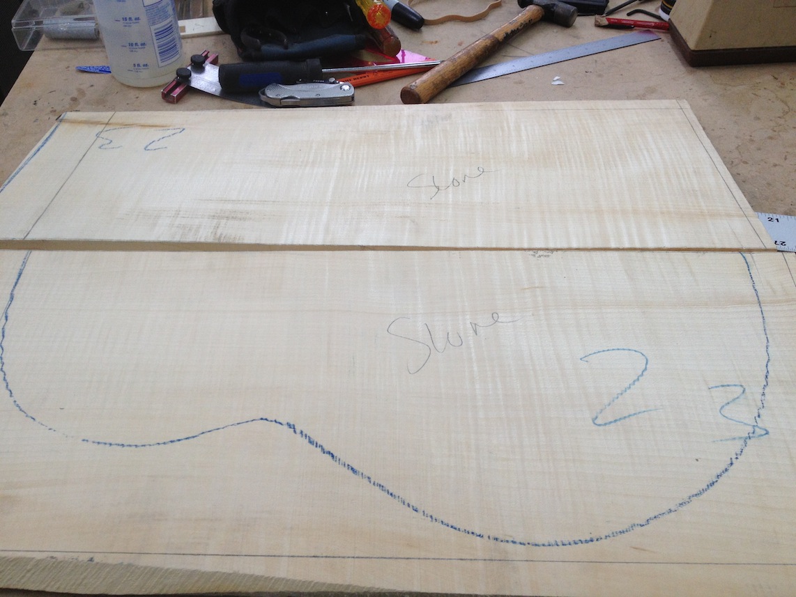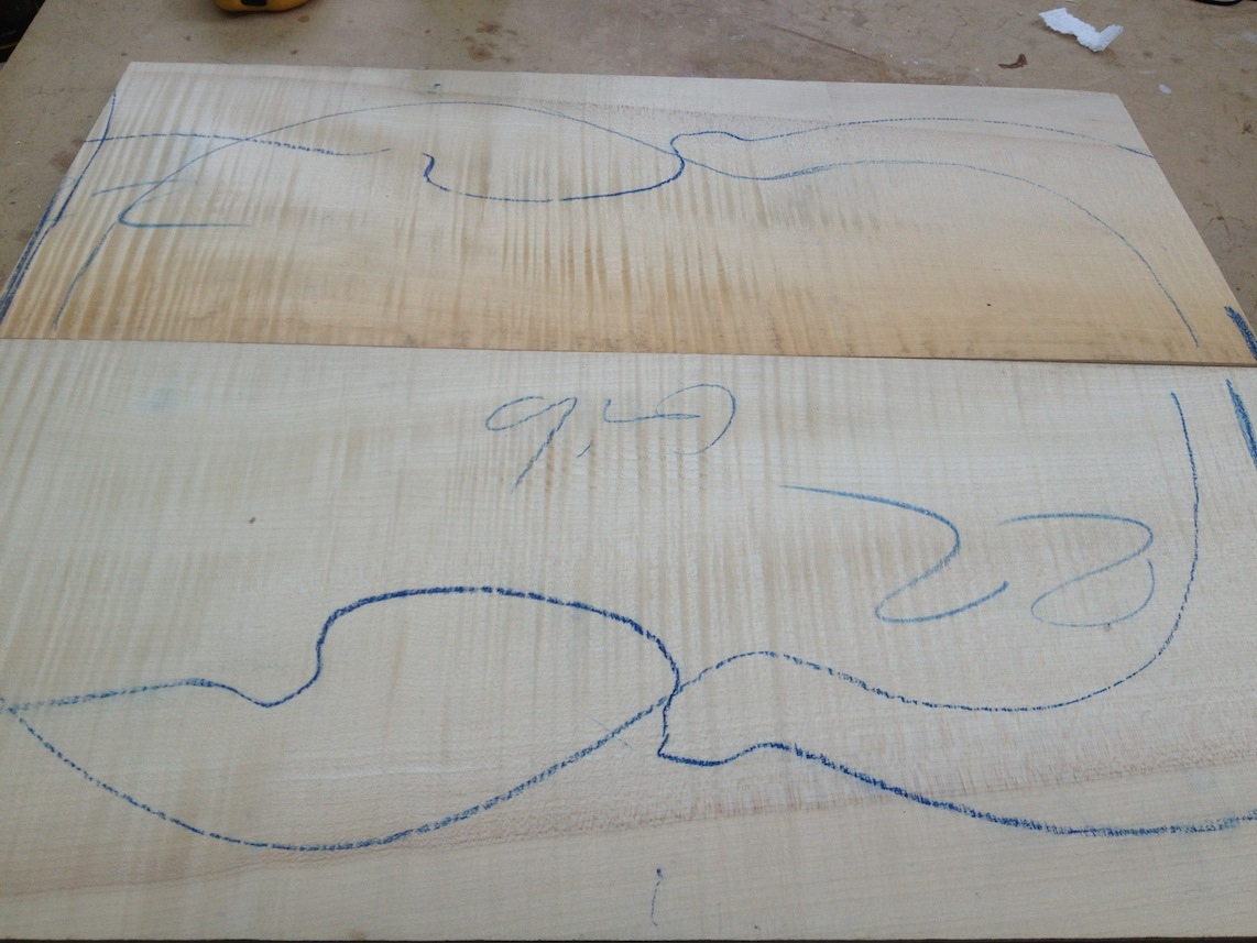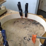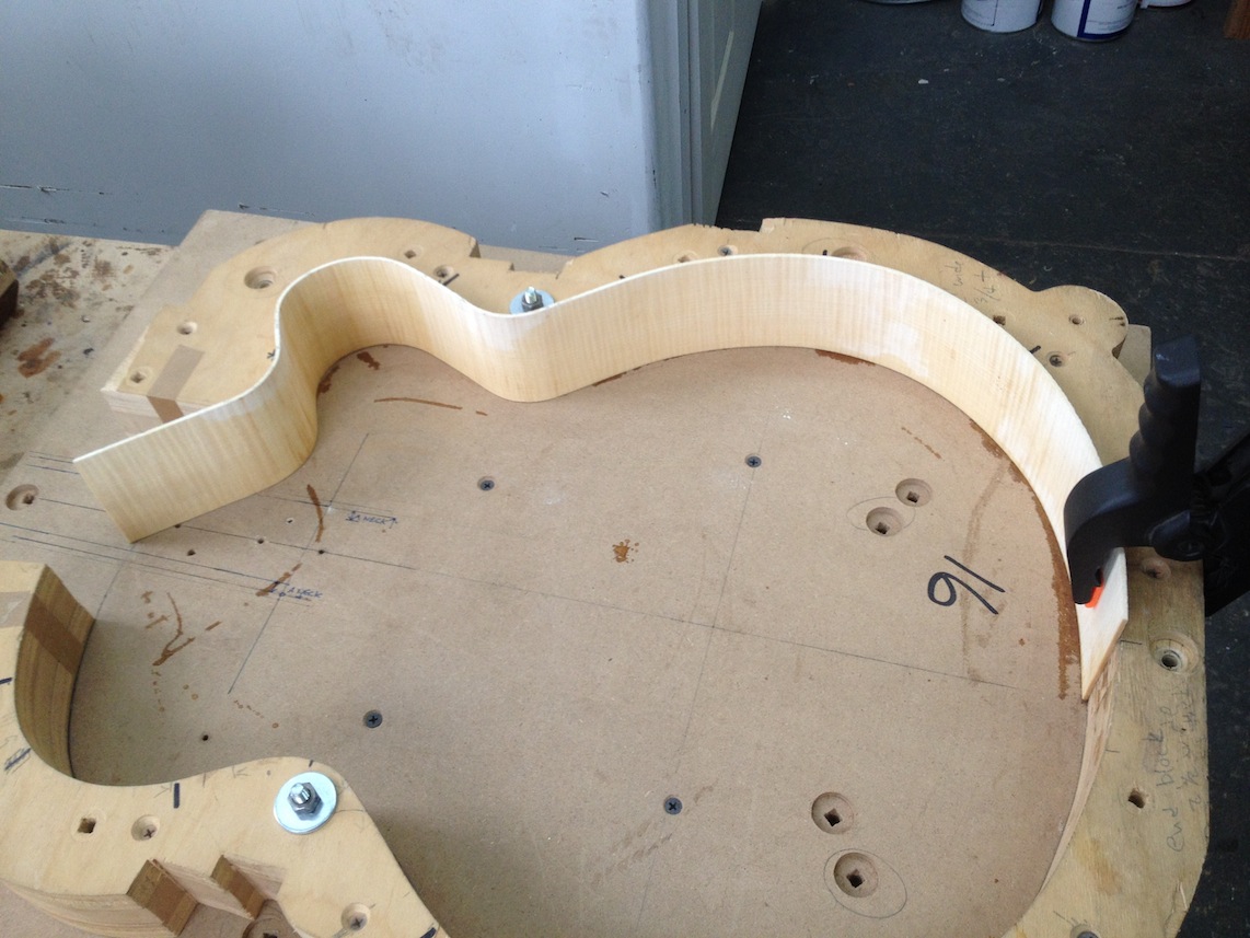 My other guitars in progress are in Patrick’s hands at the moment for clear coats, he’s doing great-they are turning out fantastic (see below). So in the interim i put some time in on the roughing work on my next guitars. Some interesting stuff here- A thinline model 15 for Donato Soviero, a Model 16 for Ofer Shalmon and a BIG model 18 Super 400 size guitar for Jonathan Slone. Ive been working on a lot of smaller 14″ guitars recently so doing a monster 18″ guitar is a real change of pace and super fun. Donato’s guitar will have an earthy finish like my other projects. Ofer’s will have an amber burst and the big 18 will have a decked out D’Angelico vibe. All great looking european cello woods throughout, the 16 and 18 will have full maple binding. Smokin!! Can NOT wait to play em.