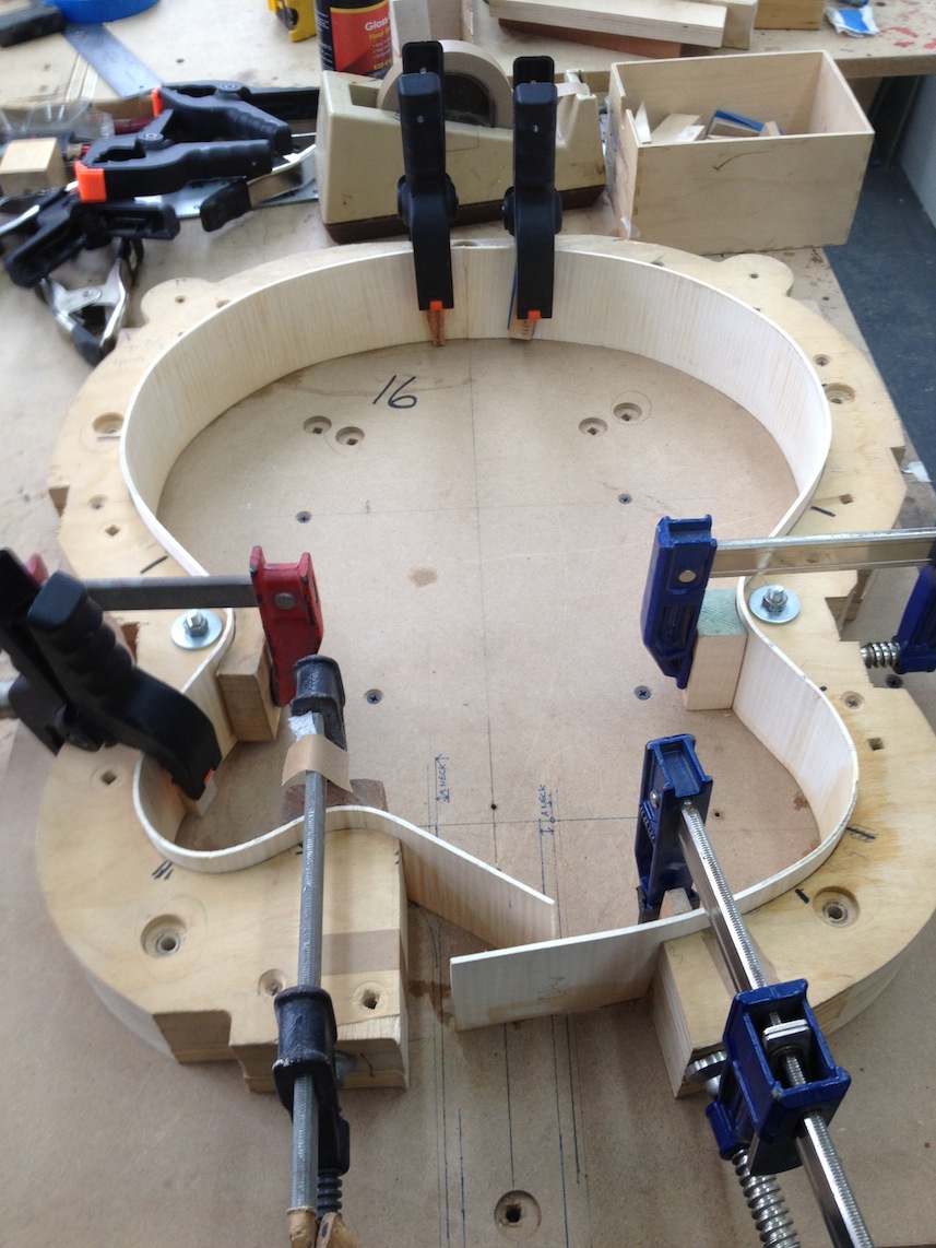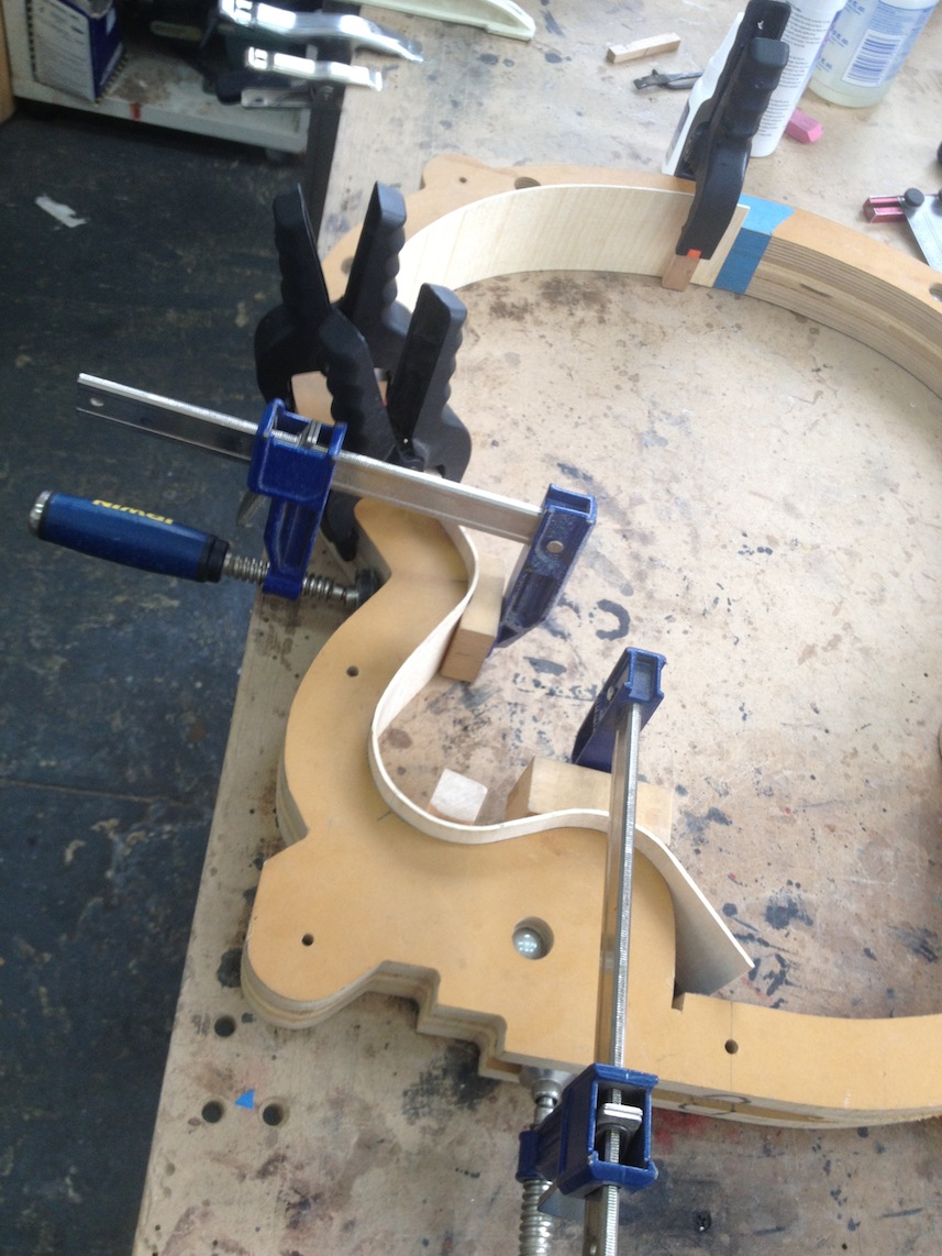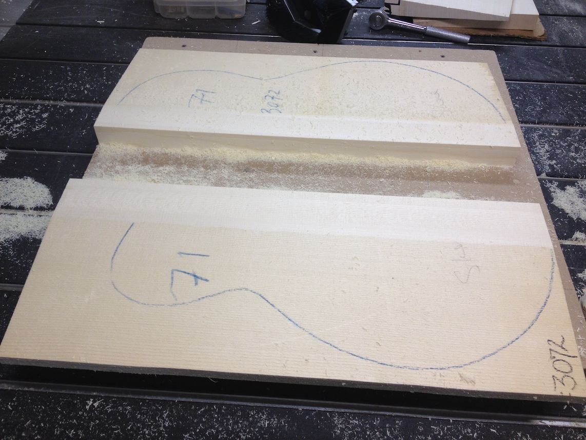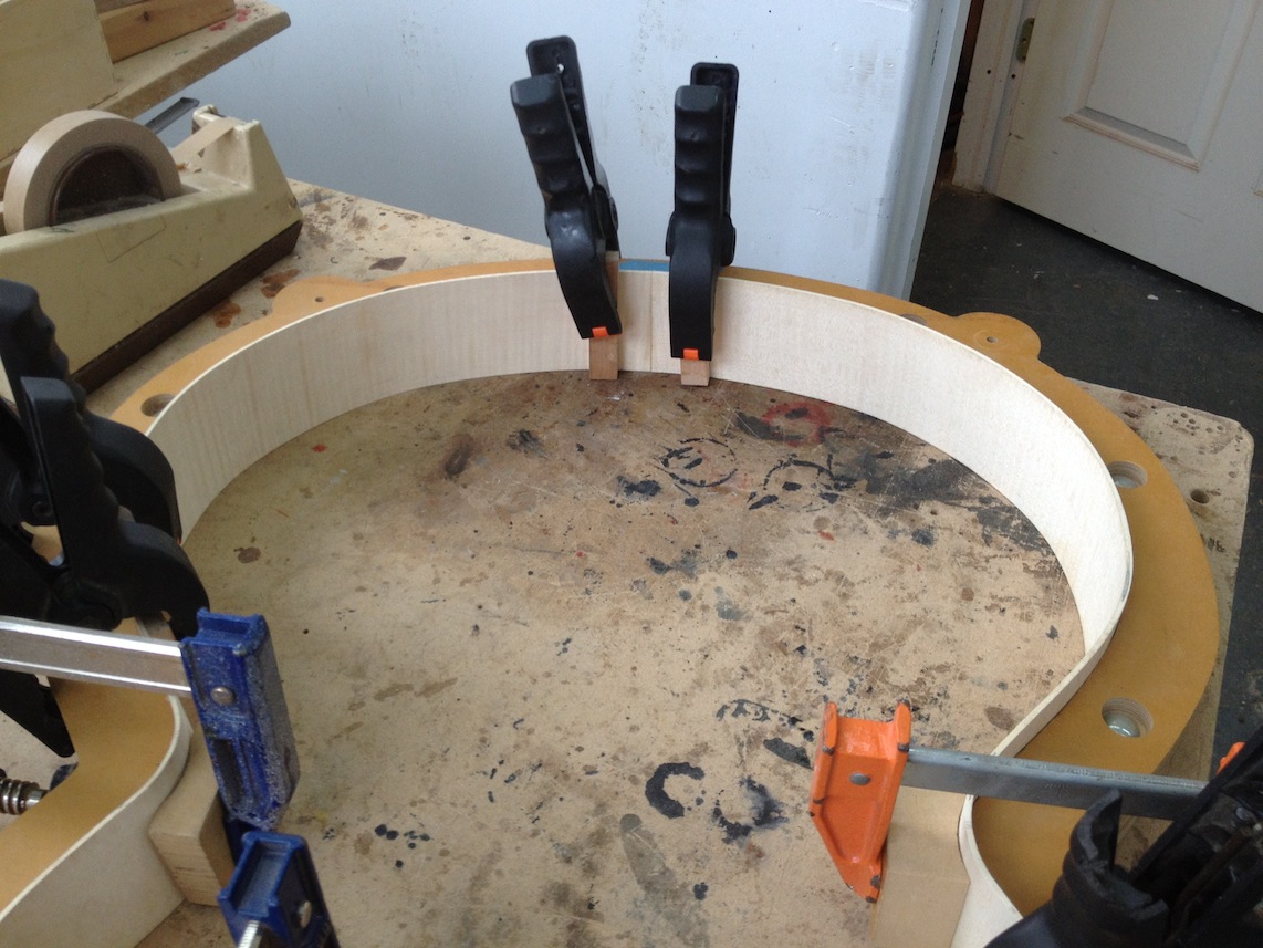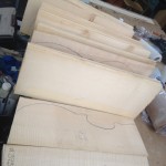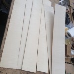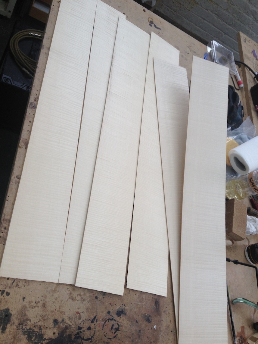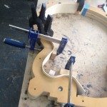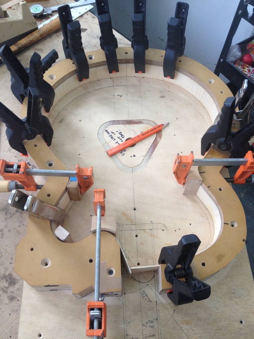 My other guitars in progress are in Patrick’s hands at the moment for clear coats, he’s doing great-they are turning out fantastic (see below). So in the interim i put some time in on the roughing work on my next guitars. Some interesting stuff here- A thinline model 15 for Donato Soviero, a Model 16 for Ofer Shalmon and a BIG model 18 Super 400 size guitar for Jonathan Slone. Ive been working on a lot of smaller 14″ guitars recently so doing a monster 18″ guitar is a real change of pace and super fun. Donato’s guitar will have an earthy finish like my other projects. Ofer’s will have an amber burst and the big 18 will have a decked out D’Angelico vibe. All great looking european cello woods throughout, the 16 and 18 will have full maple binding. Smokin!! Can NOT wait to play em.