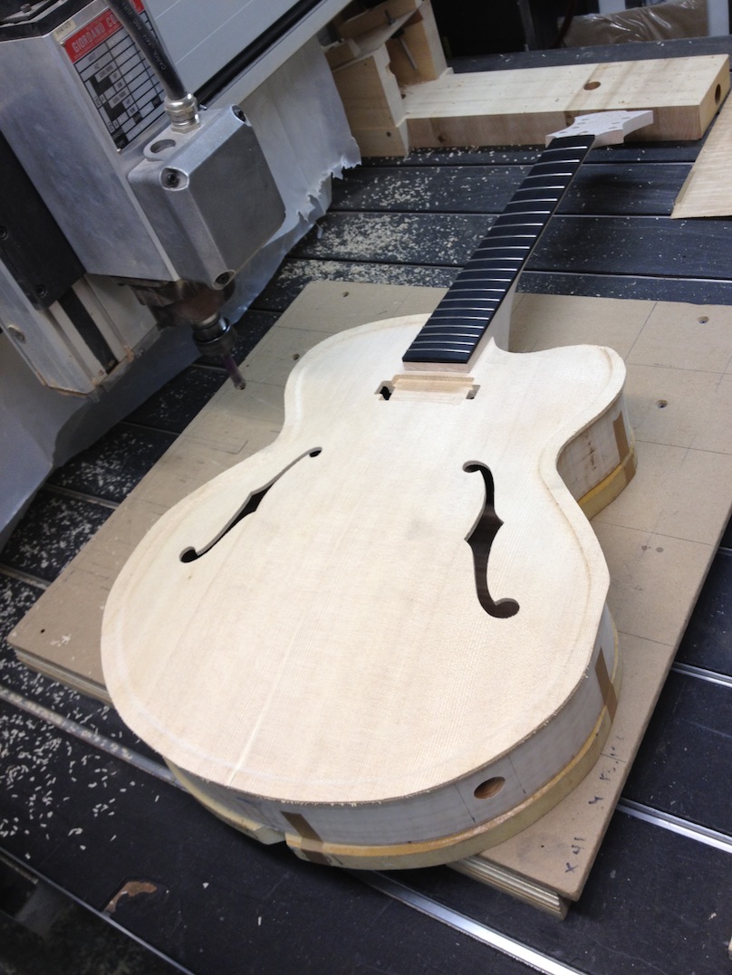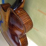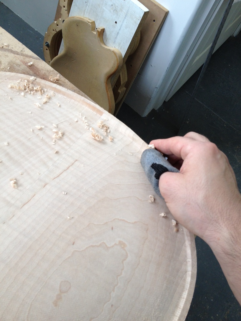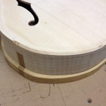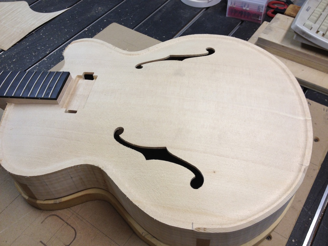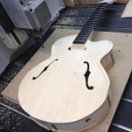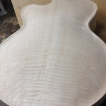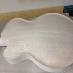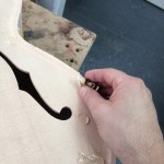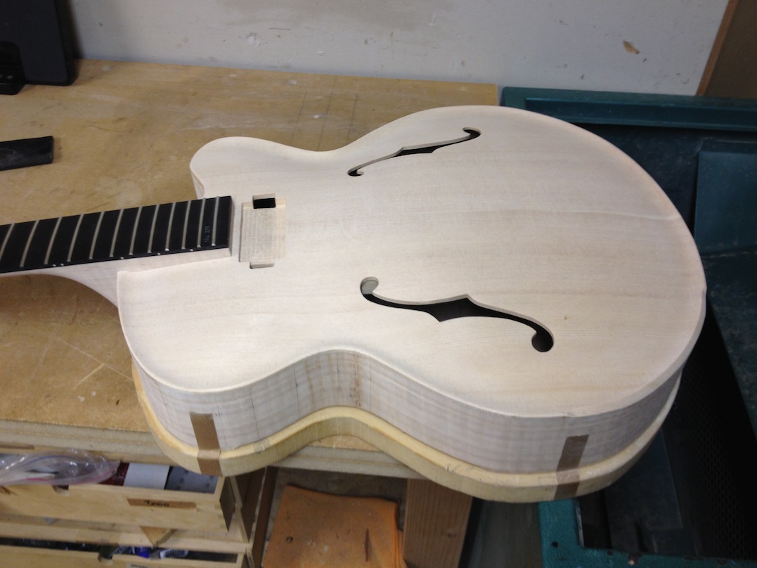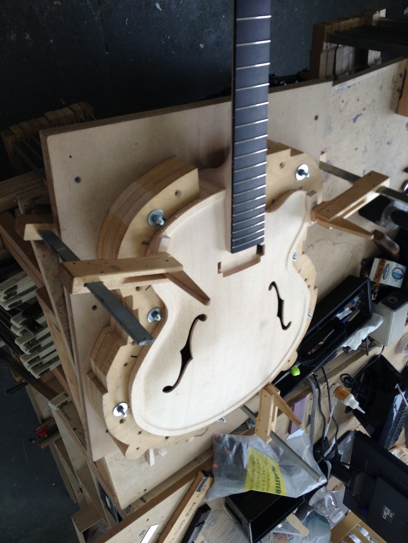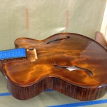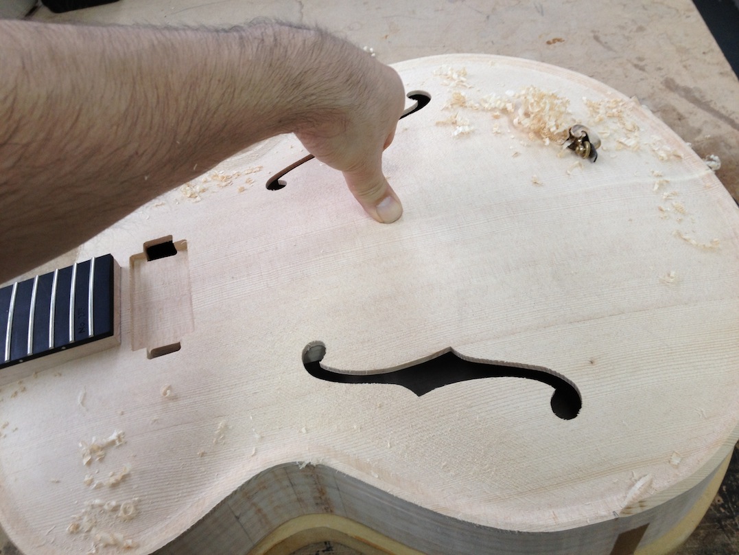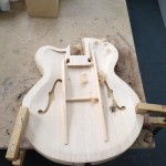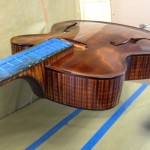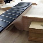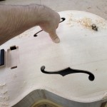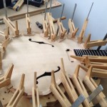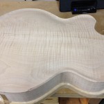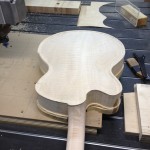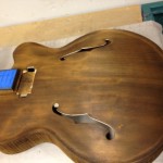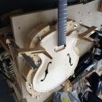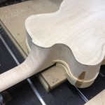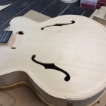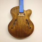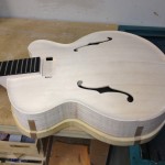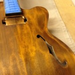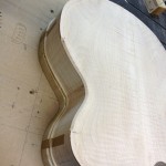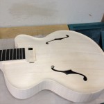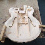 I made some huge progress on the 16″ 7 string archtop i’m building for Stan Charkey. These pictures show the progress of the build in the last week or two: Side bending, neck building, bracing, the special steps taken to construct the high access neck joint (which is a feature on all my guitars now), assembly, detailing etc etc… Theres a couple pics in there that show how i tune the plate’s final responsiveness after machine carving. Each plate is slightly different and i remove wood at the perimeter of the plate until it has a slight “give” with thumb pressure. This makes sure the top is moving like a baffle and vibrating nicely. Not too much though or the guitar will feedback. I also tap around different parts of the guitar and take a little more away where its a little stiff or too tight.