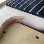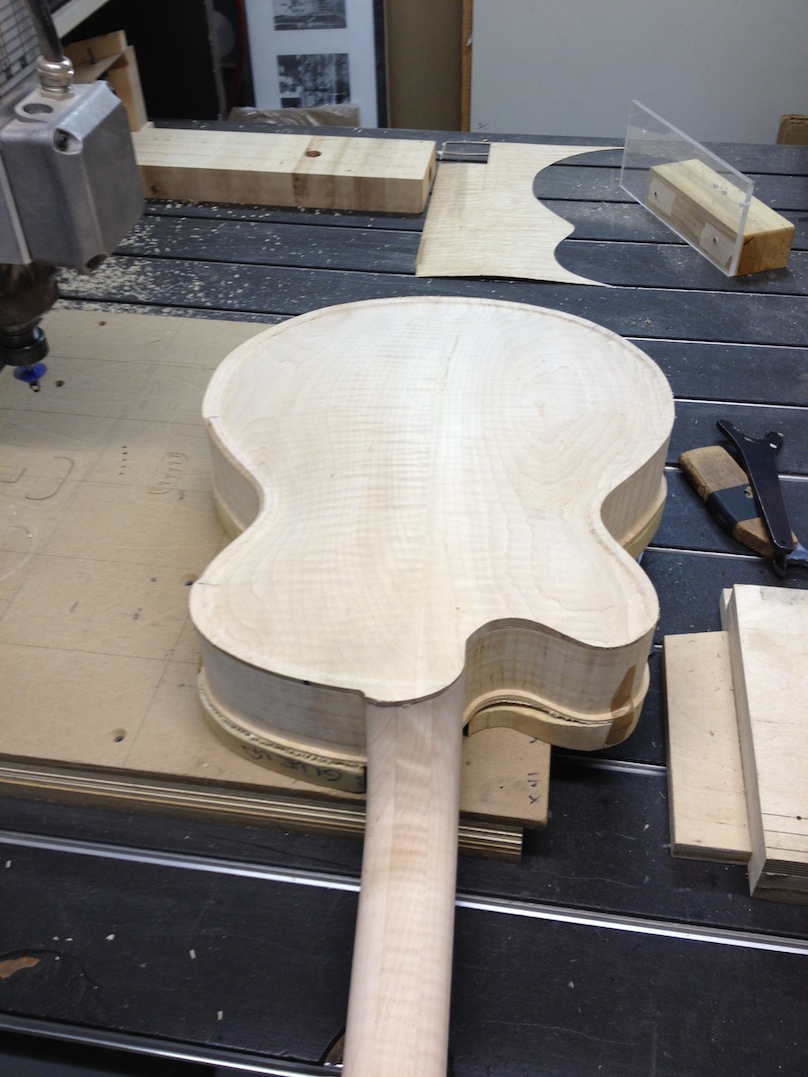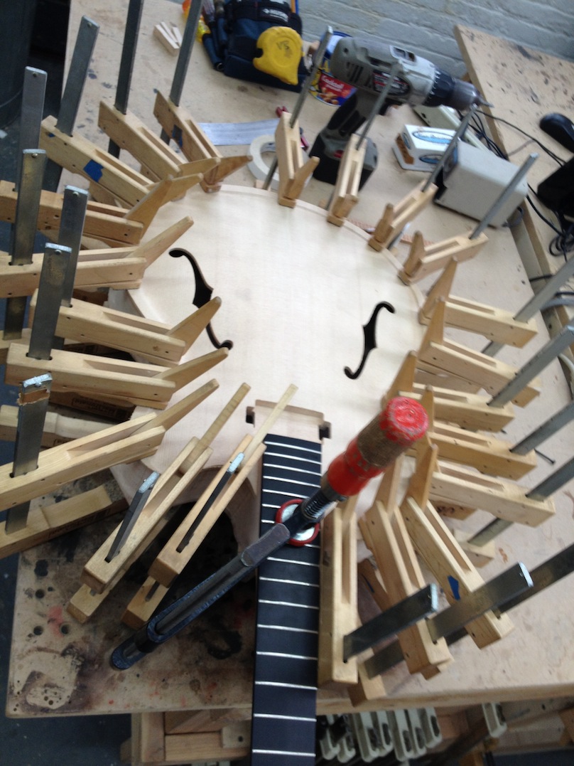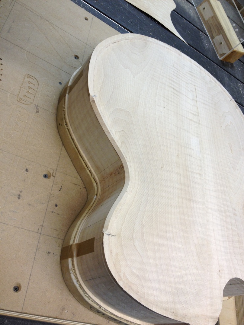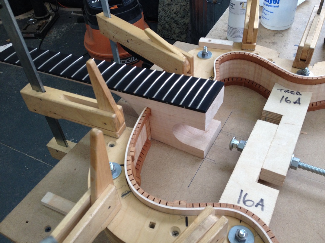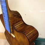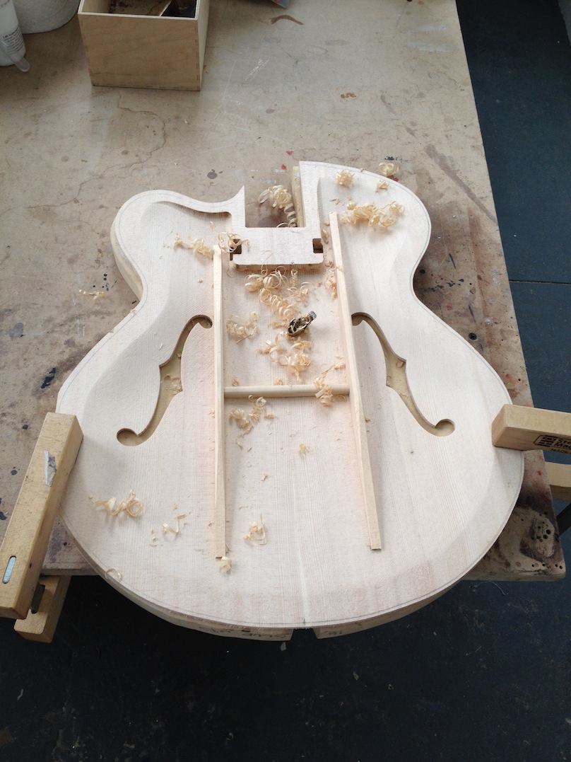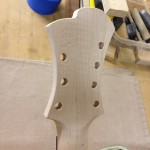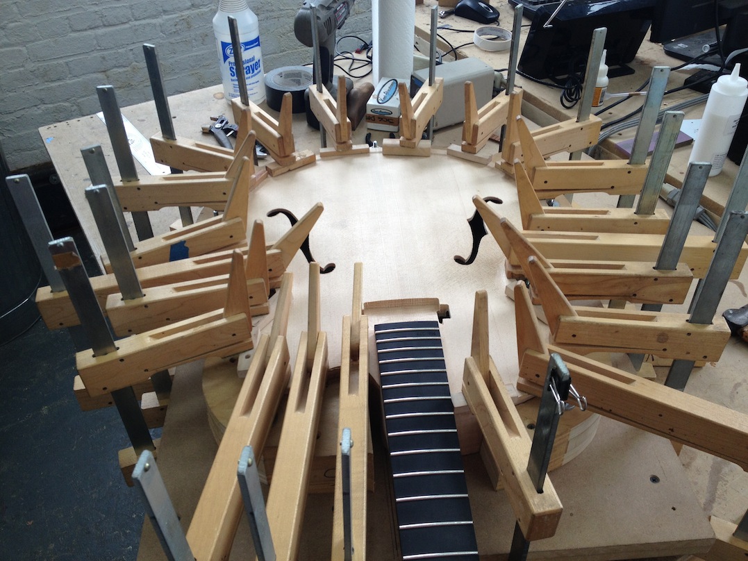 I made some huge progress on the 16″ 7 string archtop i’m building for Stan Charkey. These pictures show the progress of the build in the last week or two: Side bending, neck building, bracing, the special steps taken to construct the high access neck joint (which is a feature on all my guitars now), assembly, detailing etc etc… Theres a couple pics in there that show how i tune the plate’s final responsiveness after machine carving. Each plate is slightly different and i remove wood at the perimeter of the plate until it has a slight “give” with thumb pressure. This makes sure the top is moving like a baffle and vibrating nicely. Not too much though or the guitar will feedback. I also tap around different parts of the guitar and take a little more away where its a little stiff or too tight.