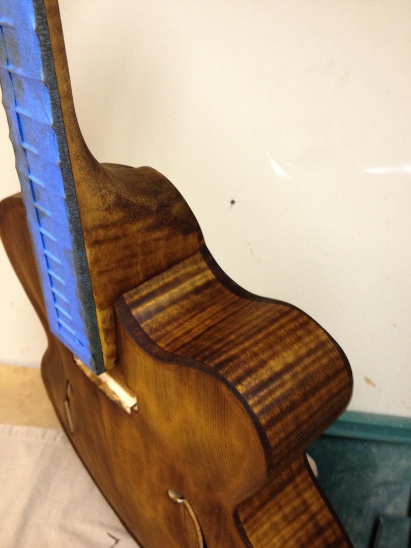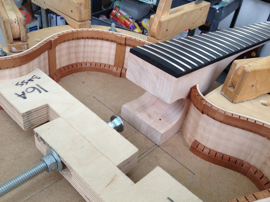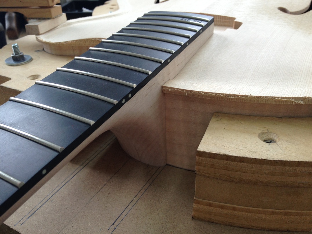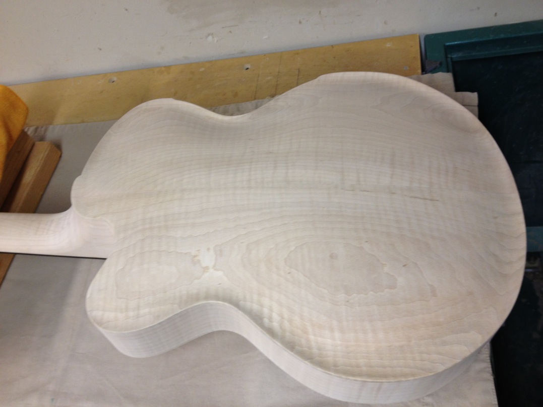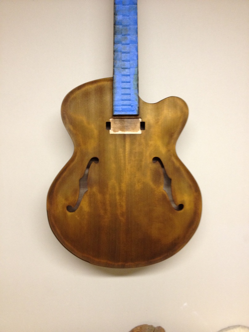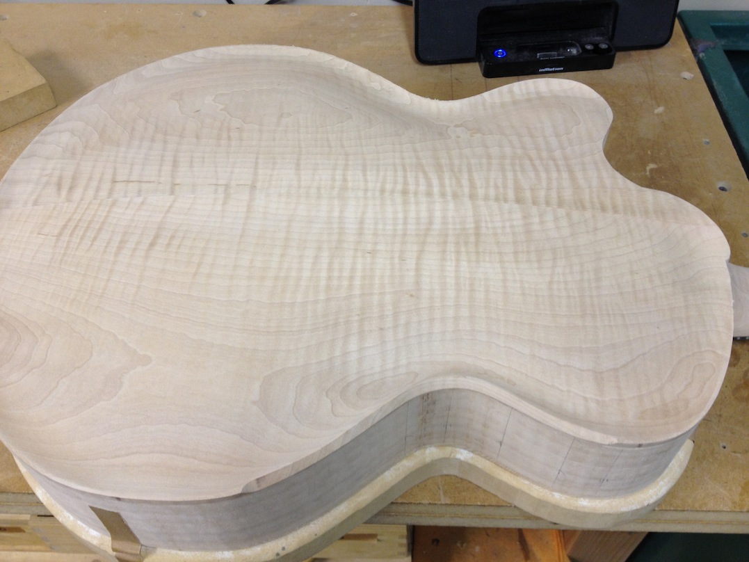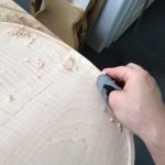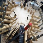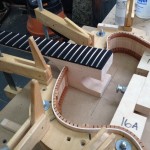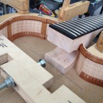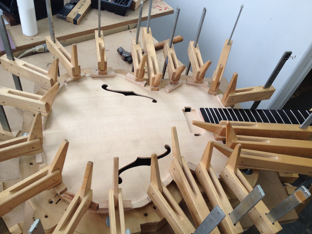 I made some huge progress on the 16″ 7 string archtop i’m building for Stan Charkey. These pictures show the progress of the build in the last week or two: Side bending, neck building, bracing, the special steps taken to construct the high access neck joint (which is a feature on all my guitars now), assembly, detailing etc etc… Theres a couple pics in there that show how i tune the plate’s final responsiveness after machine carving. Each plate is slightly different and i remove wood at the perimeter of the plate until it has a slight “give” with thumb pressure. This makes sure the top is moving like a baffle and vibrating nicely. Not too much though or the guitar will feedback. I also tap around different parts of the guitar and take a little more away where its a little stiff or too tight.