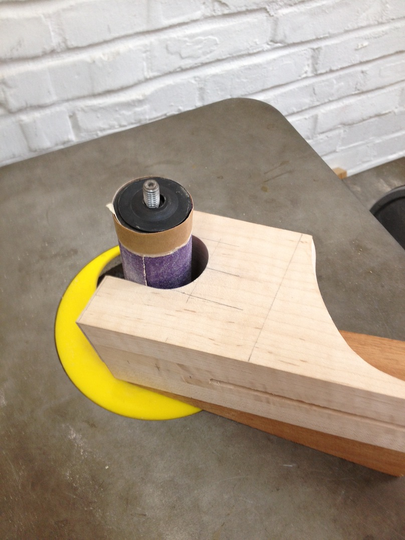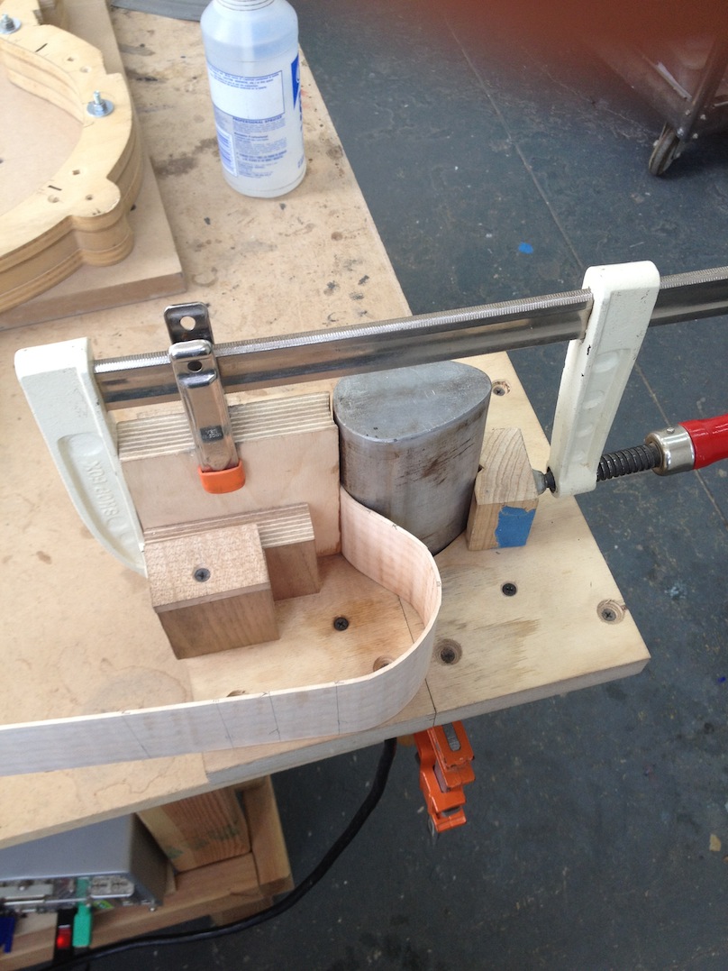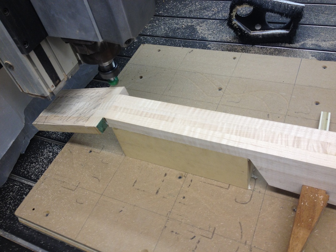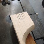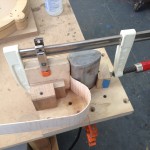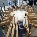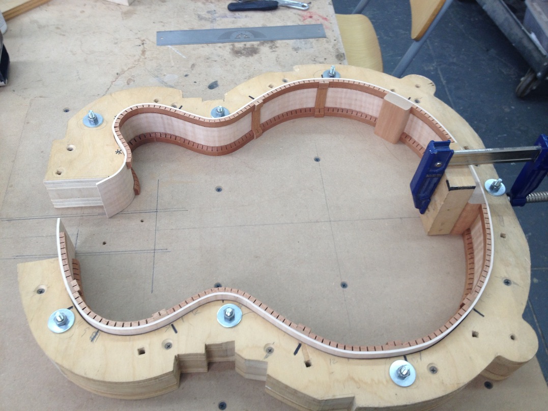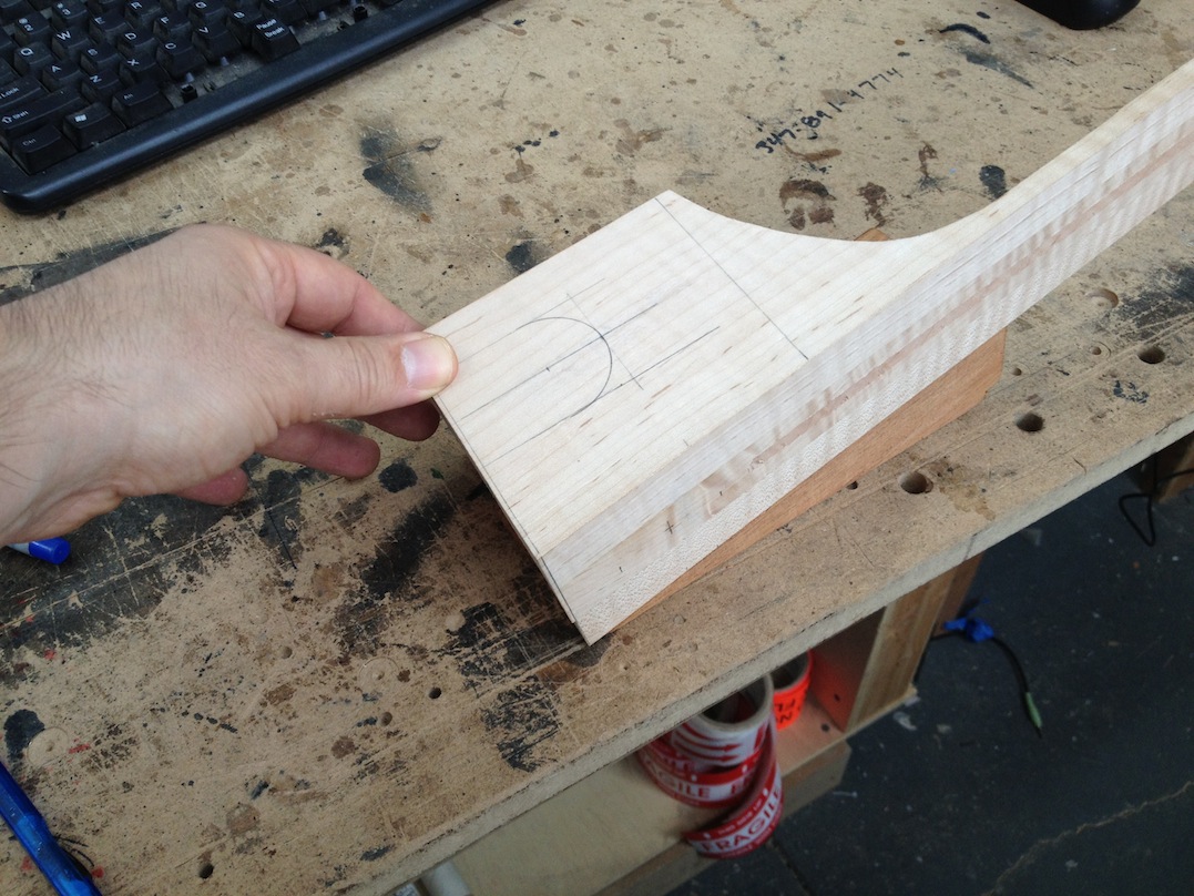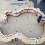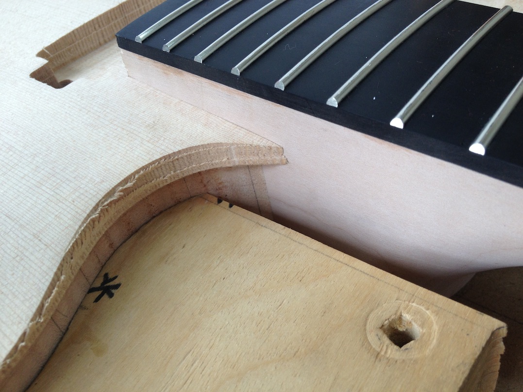 I made some huge progress on the 16″ 7 string archtop i’m building for Stan Charkey. These pictures show the progress of the build in the last week or two: Side bending, neck building, bracing, the special steps taken to construct the high access neck joint (which is a feature on all my guitars now), assembly, detailing etc etc… Theres a couple pics in there that show how i tune the plate’s final responsiveness after machine carving. Each plate is slightly different and i remove wood at the perimeter of the plate until it has a slight “give” with thumb pressure. This makes sure the top is moving like a baffle and vibrating nicely. Not too much though or the guitar will feedback. I also tap around different parts of the guitar and take a little more away where its a little stiff or too tight.