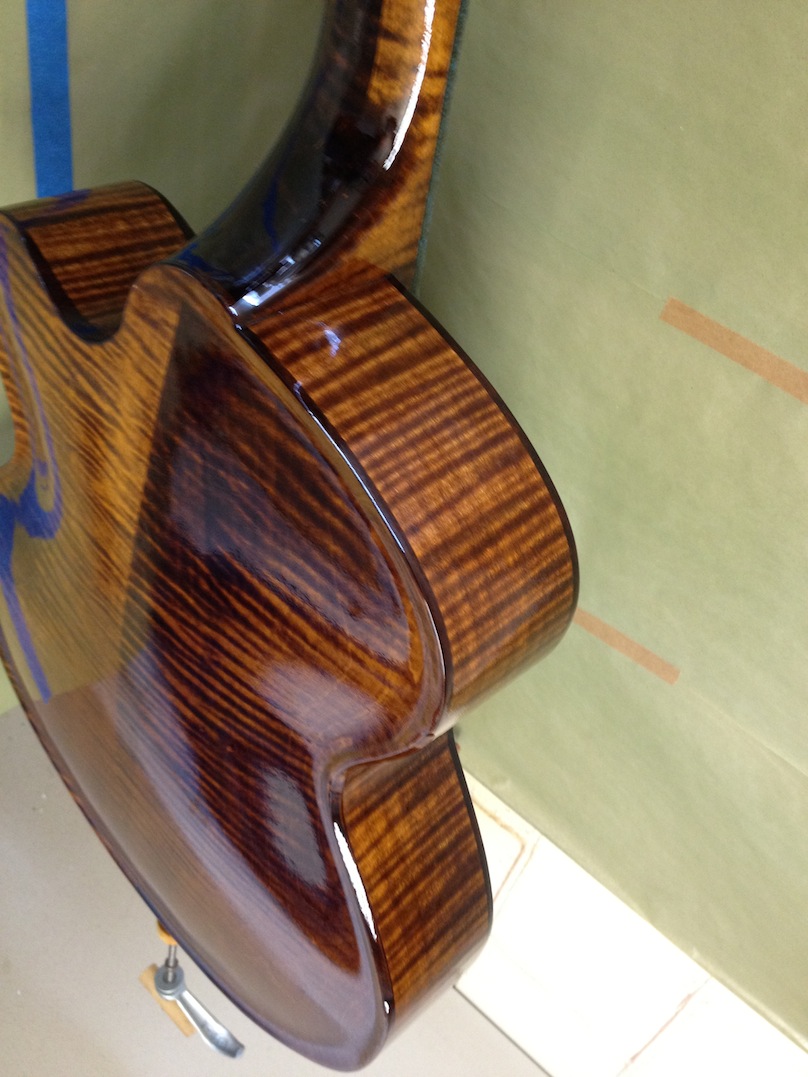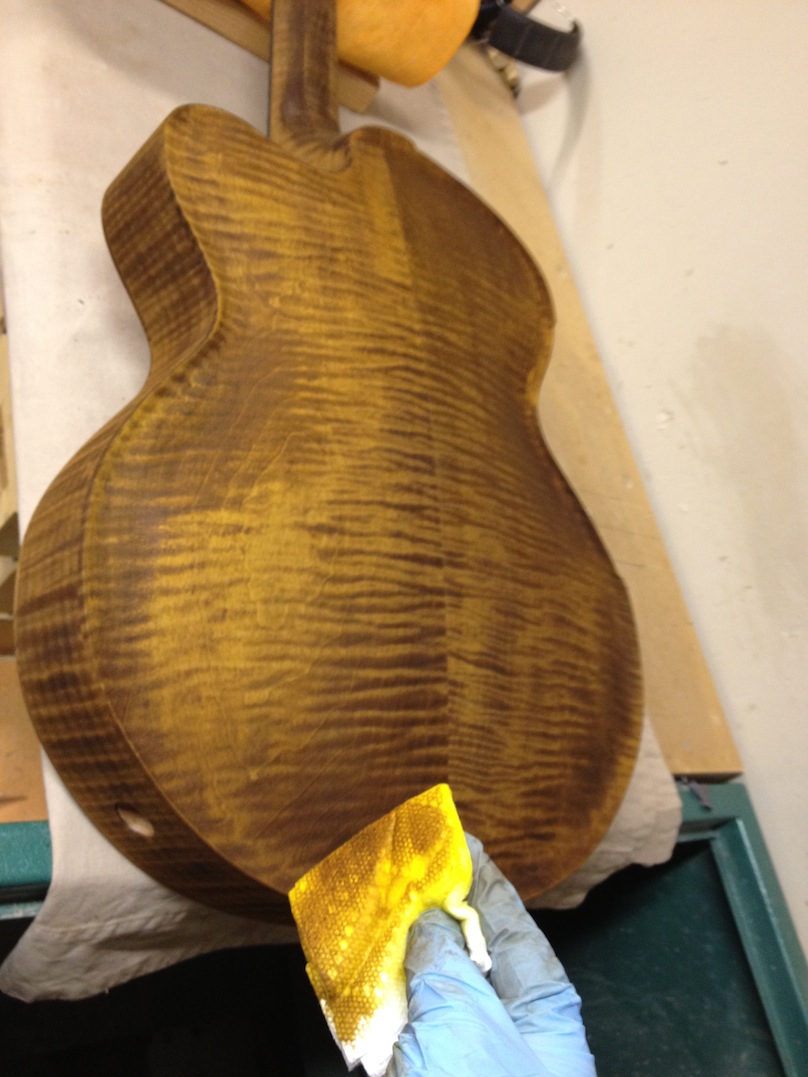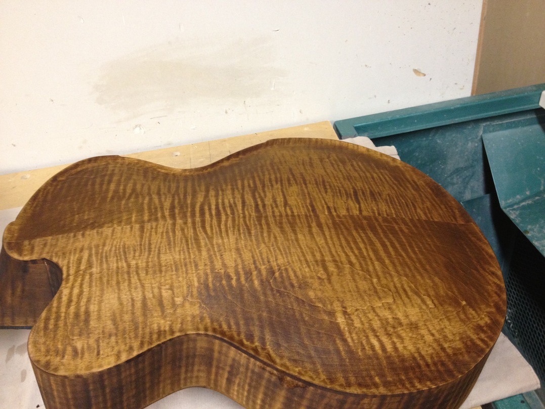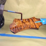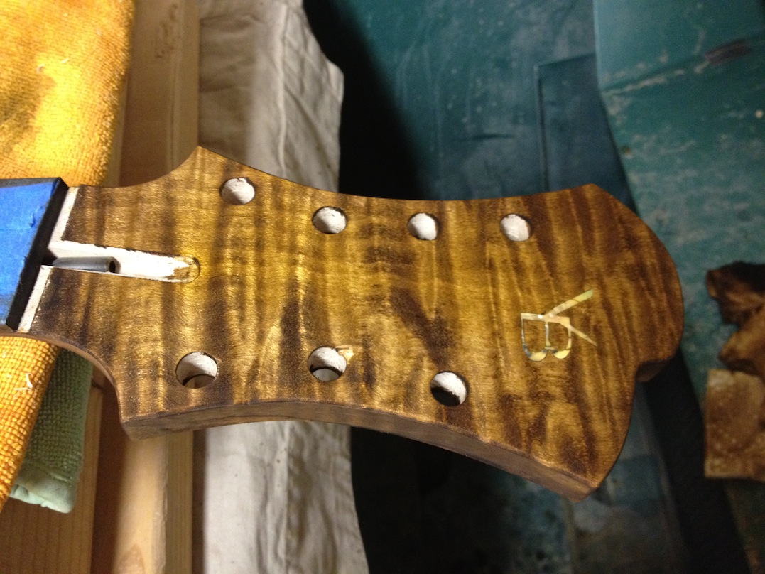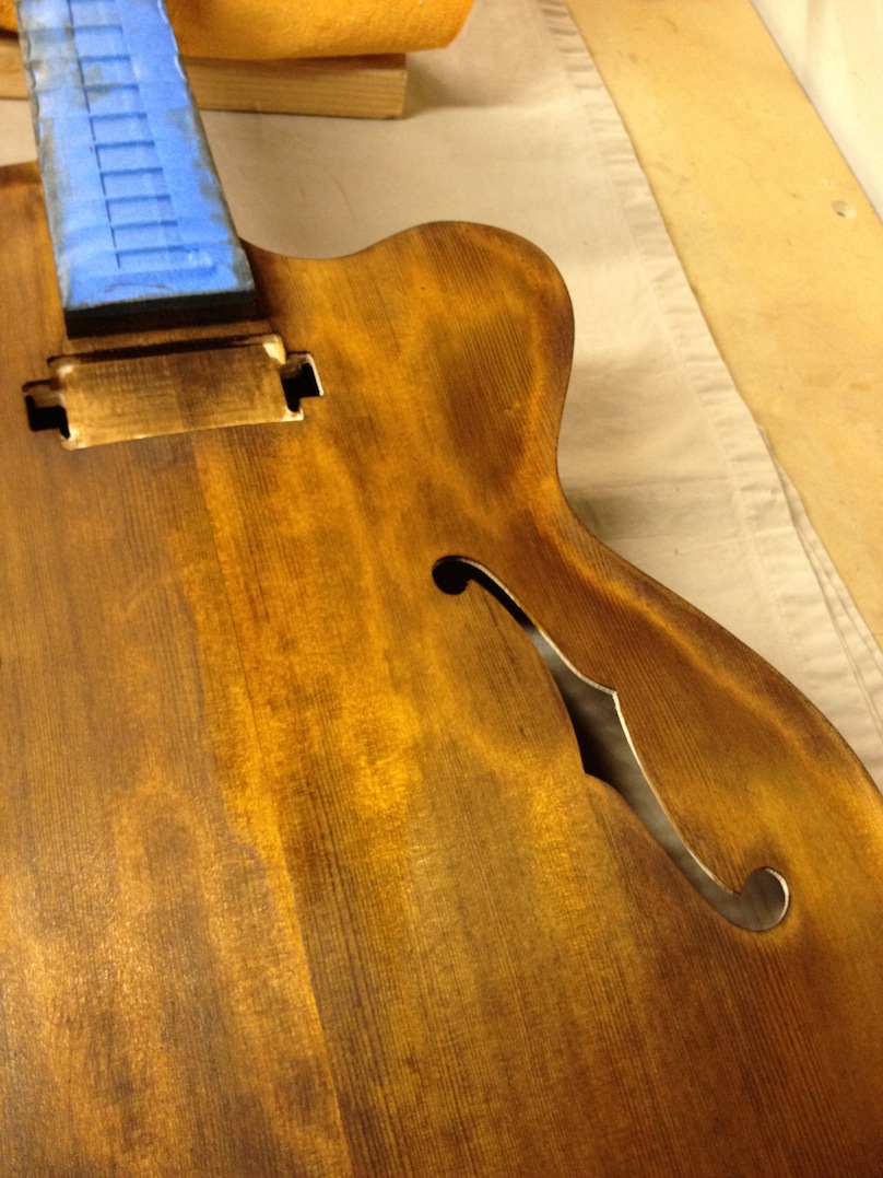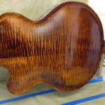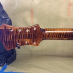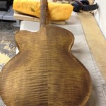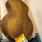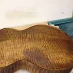 Also shown is the detailing prior to finish, as well as the staining. Last shots show the color after getting a few clear coats. Stan asked me to paint the guitar with this guitar i did a few years ago in mind (more pics here). It is a golden brown stain topped with a yellow stain. It takes its final shade after the first coats of clear hit it. The spruce has some killer figuring- it looks electric! Maple is rock’n too. Final clear coats go on tomorrow!