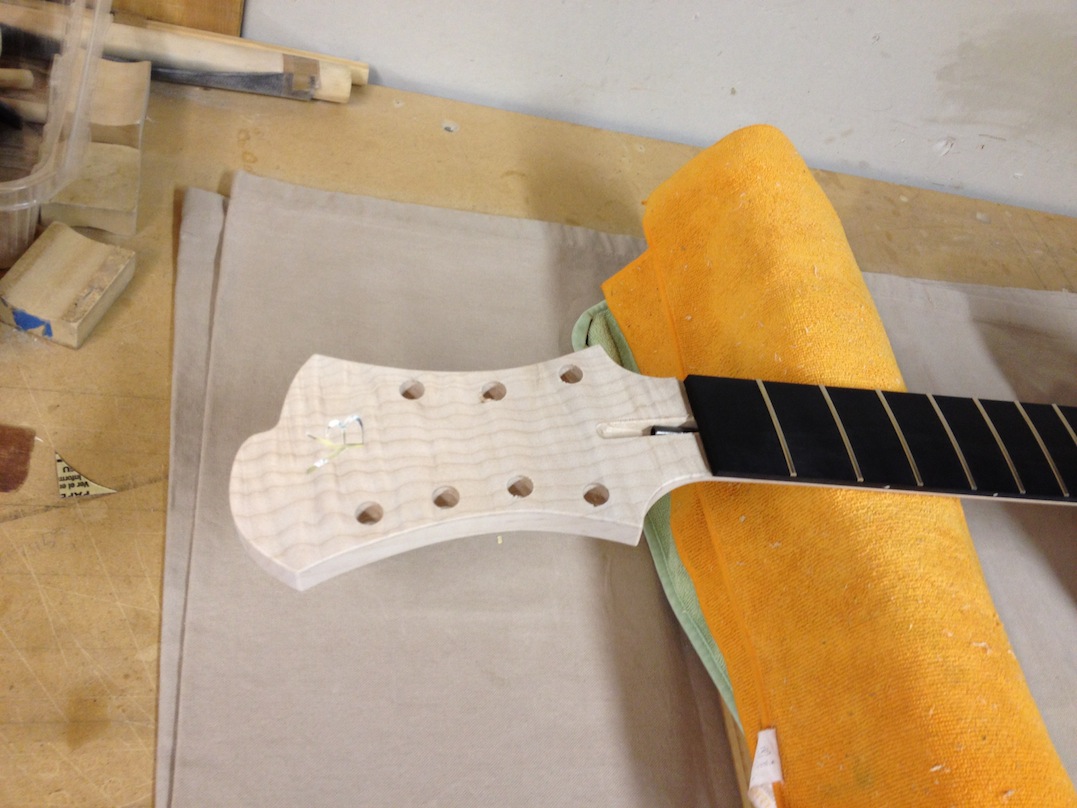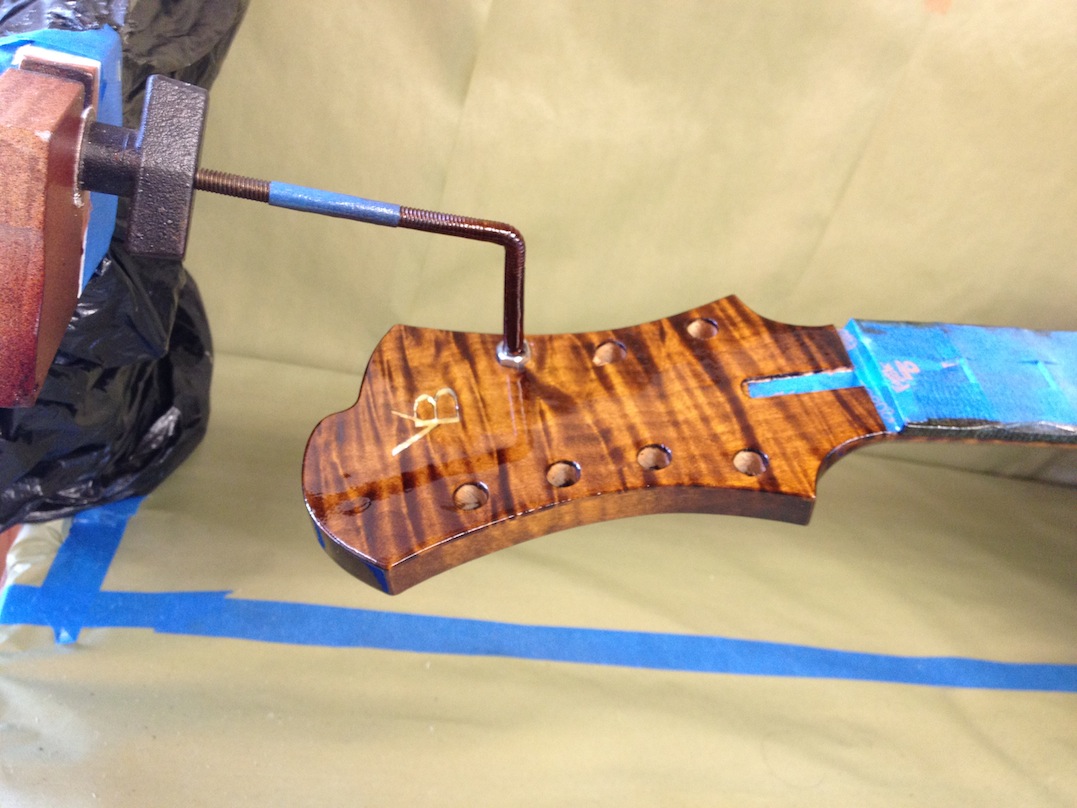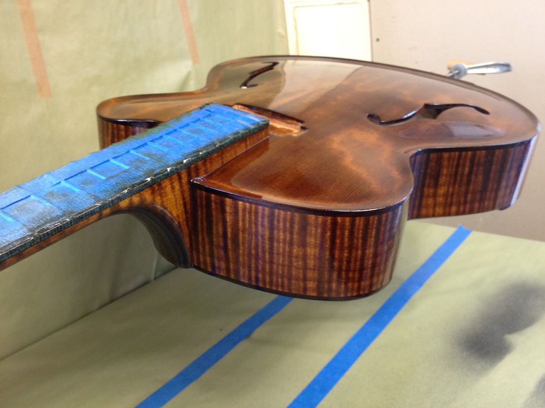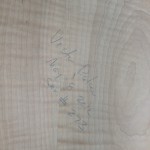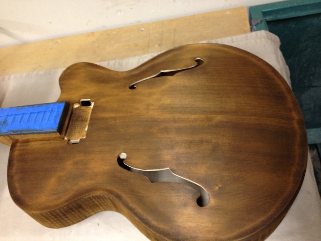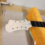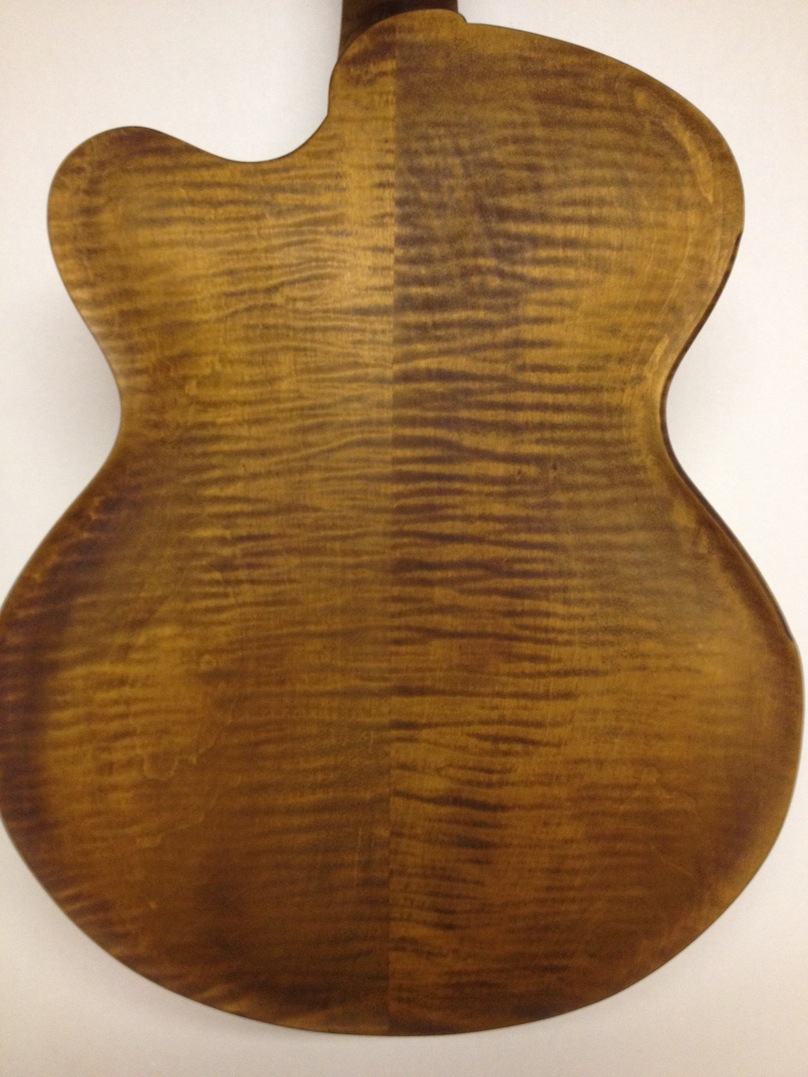 Also shown is the detailing prior to finish, as well as the staining. Last shots show the color after getting a few clear coats. Stan asked me to paint the guitar with this guitar i did a few years ago in mind (more pics here). It is a golden brown stain topped with a yellow stain. It takes its final shade after the first coats of clear hit it. The spruce has some killer figuring- it looks electric! Maple is rock’n too. Final clear coats go on tomorrow!