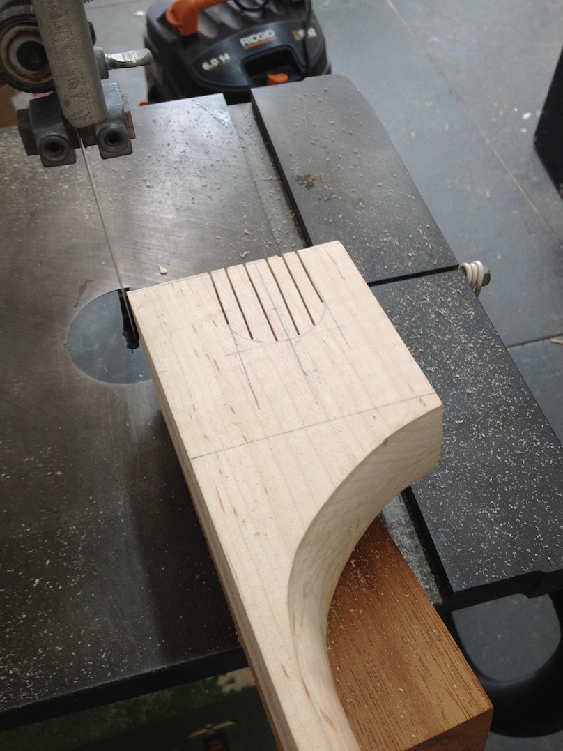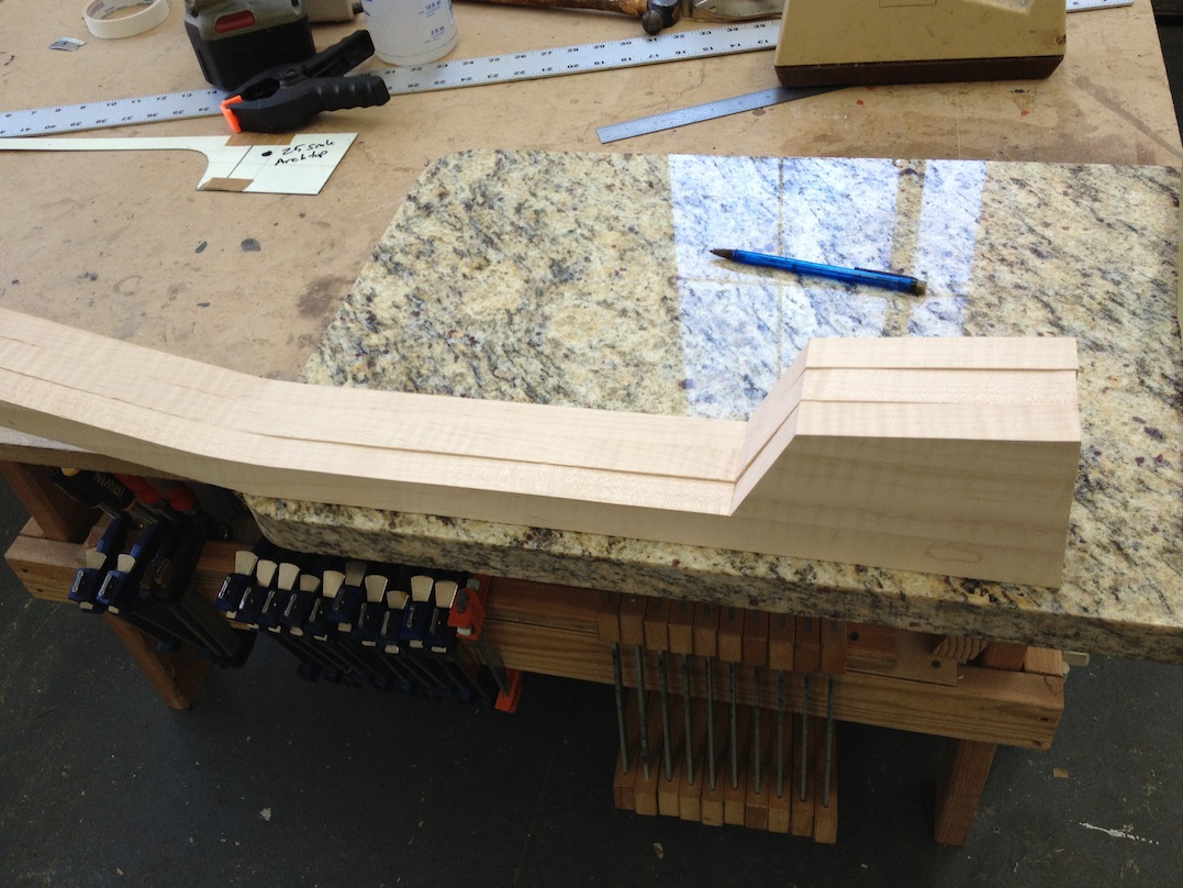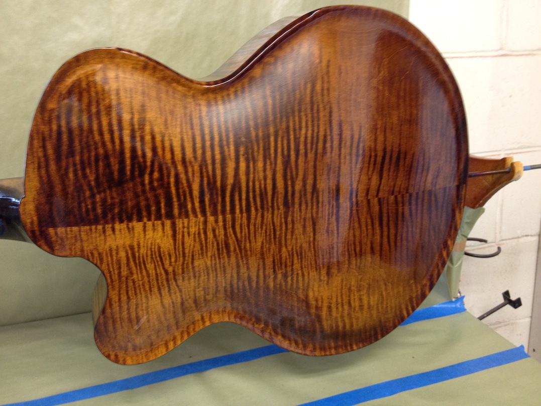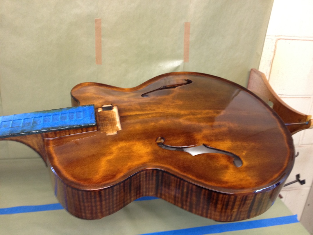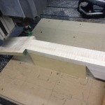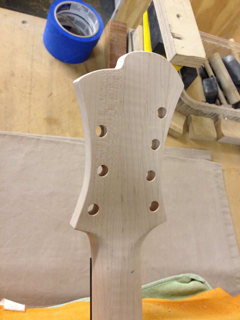 Also shown is the detailing prior to finish, as well as the staining. Last shots show the color after getting a few clear coats. Stan asked me to paint the guitar with this guitar i did a few years ago in mind (more pics here). It is a golden brown stain topped with a yellow stain. It takes its final shade after the first coats of clear hit it. The spruce has some killer figuring- it looks electric! Maple is rock’n too. Final clear coats go on tomorrow!