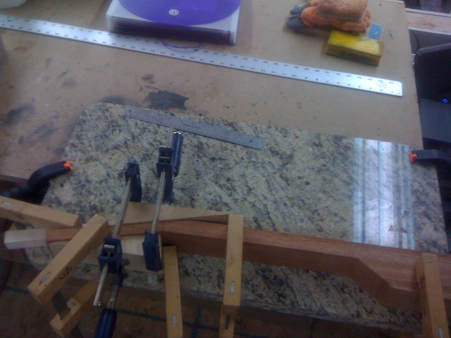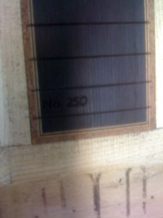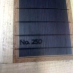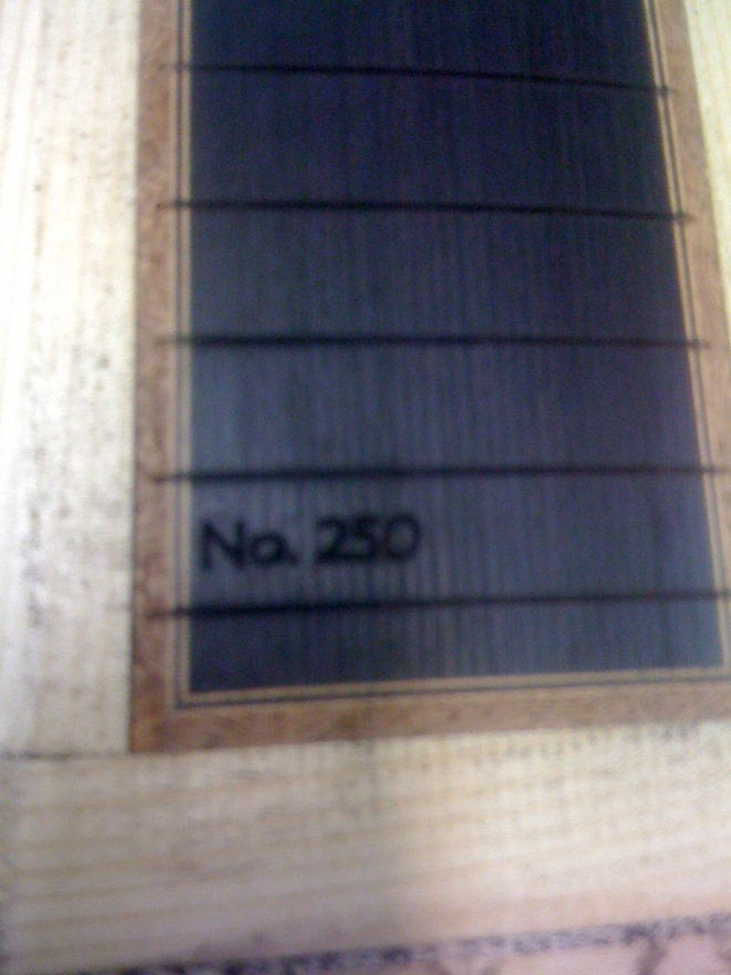 neck and fingerboard work… headstock angle, fingerboard assembly (quilted mahogany binding!). Cool No. 250 engraving, just a little bigger than normal 8^)