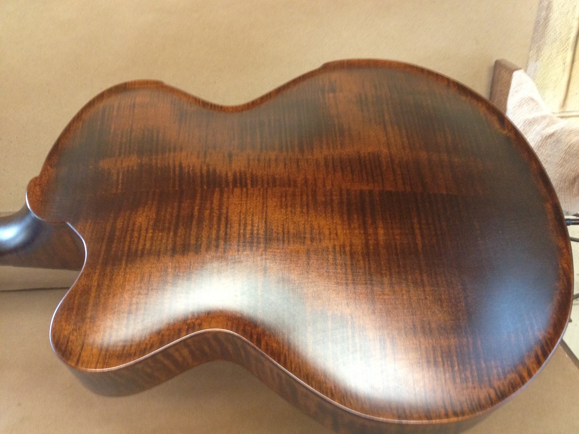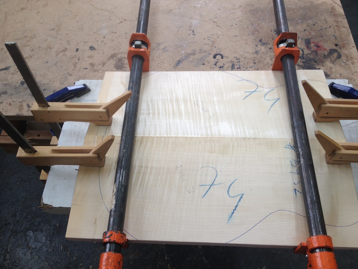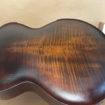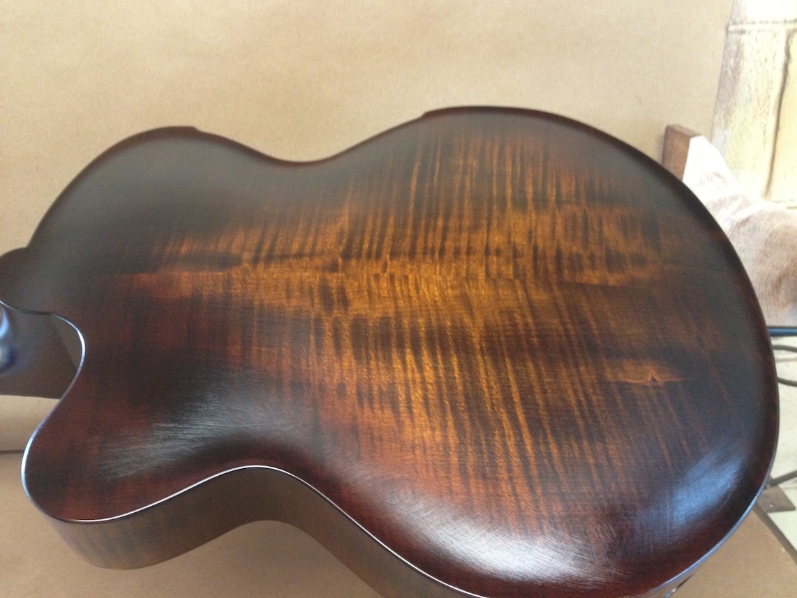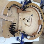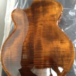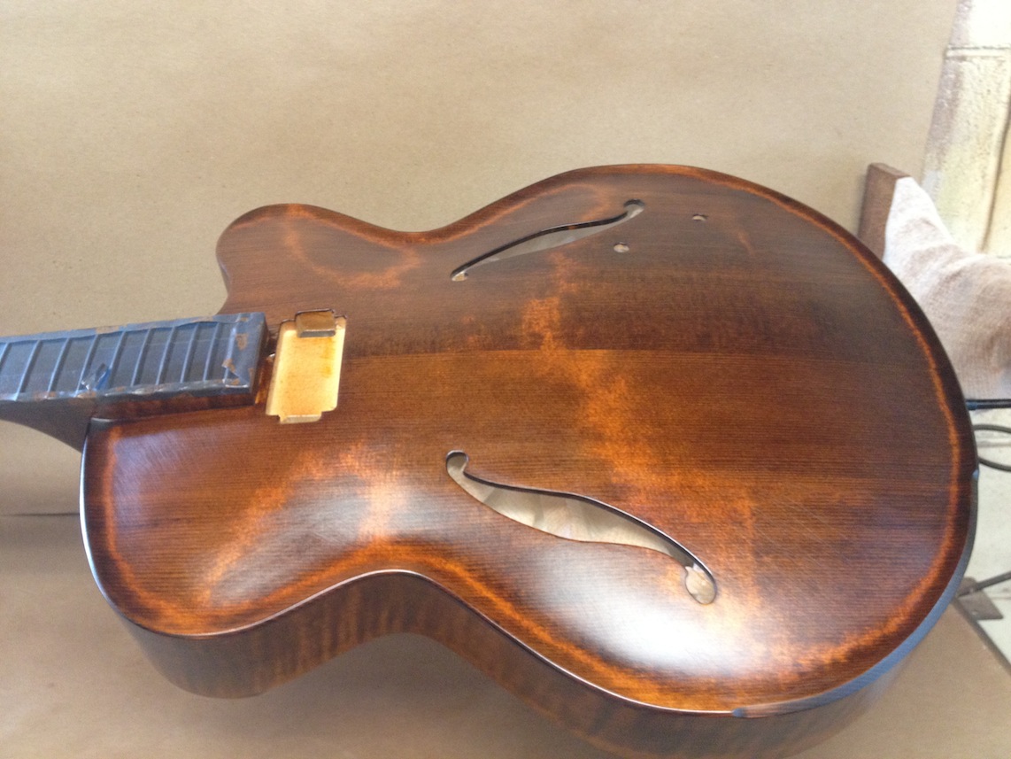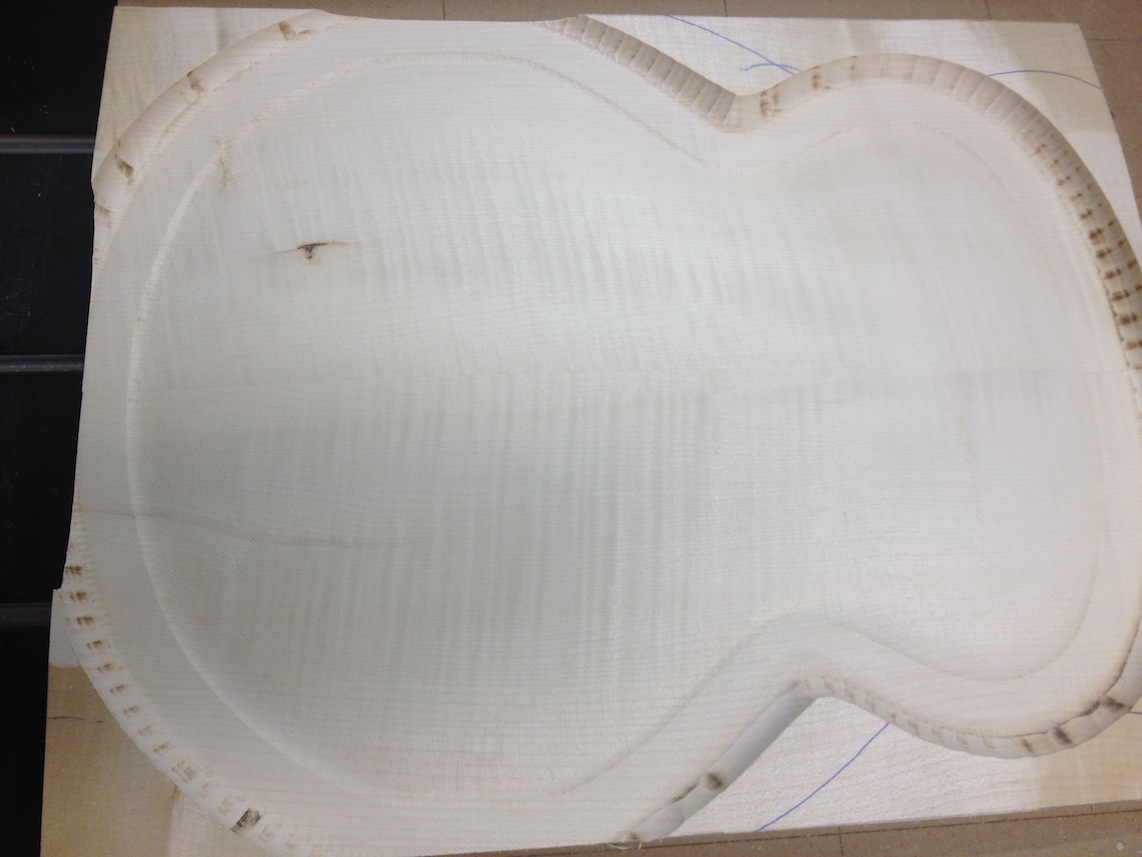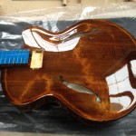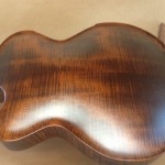 I’m using really fine European cello tonewood here throughout. During carving I ran into a hidden defect on Gilad’s backplate. We talked about it and decided to use it anyway instead of throwing it out. Some builders or players shy away from or reject defects like that but we decided not to argue with mother nature- it would look just fine with the earthy stain finish theme we picked. In fact I think it looks really beautiful! This wood grew in the forest for hundreds of years and i feel weird to just “throw it out”- see this video.