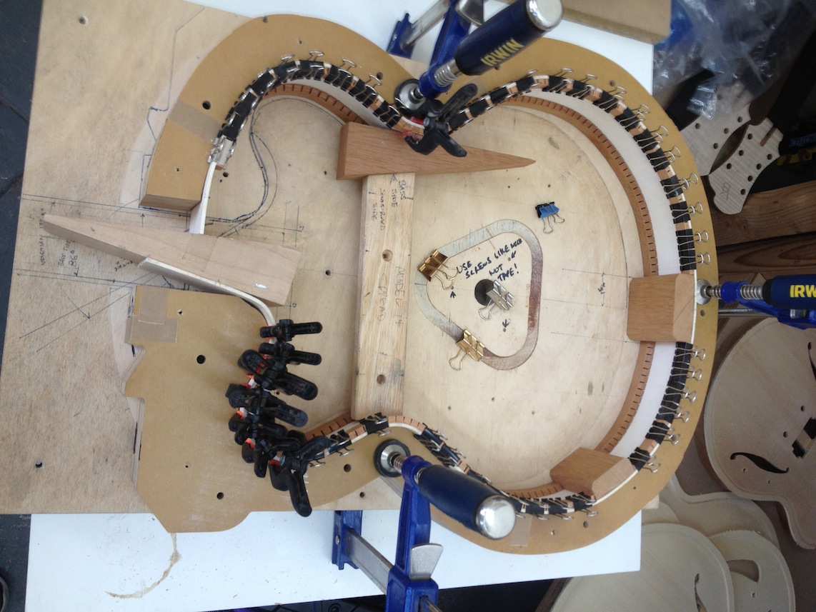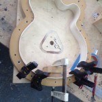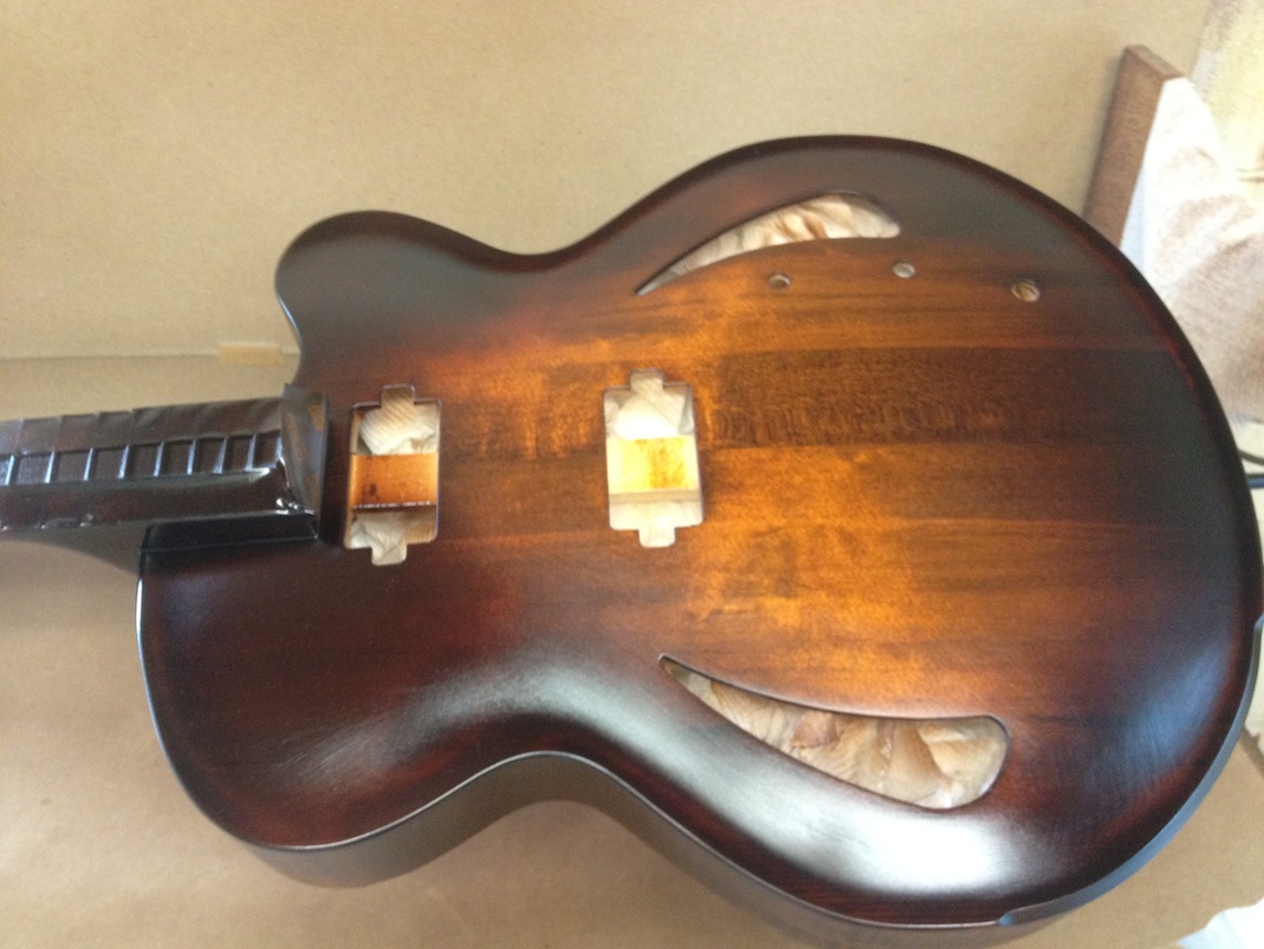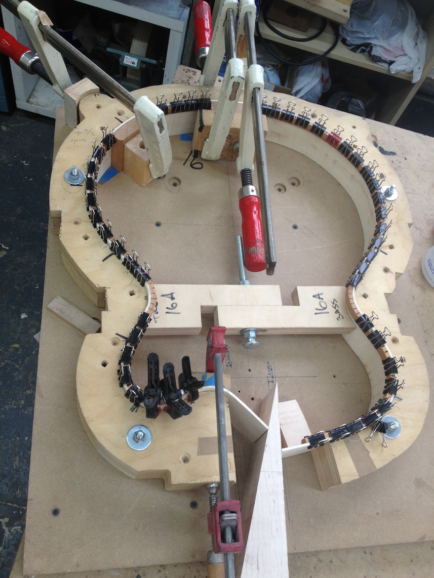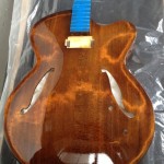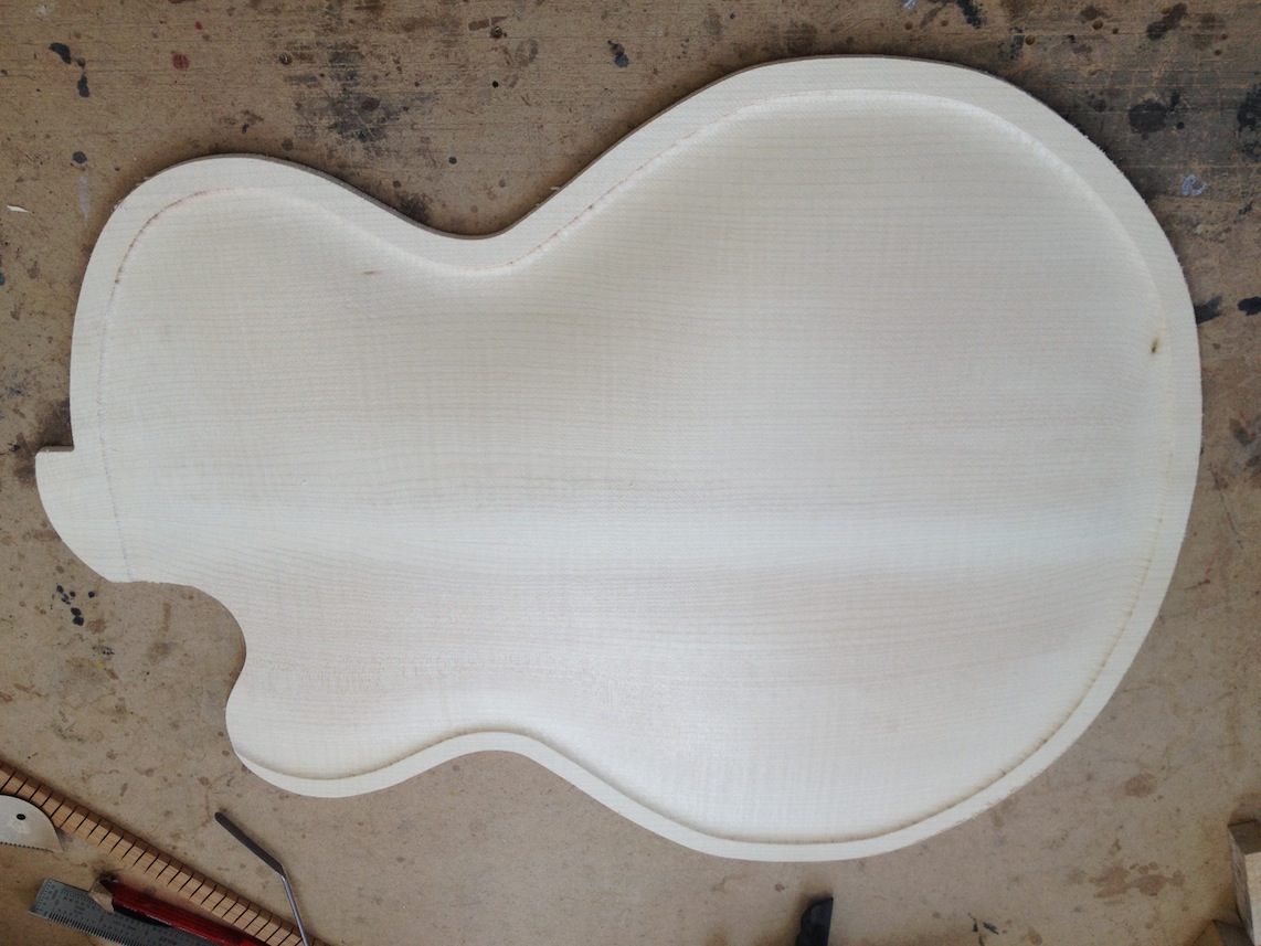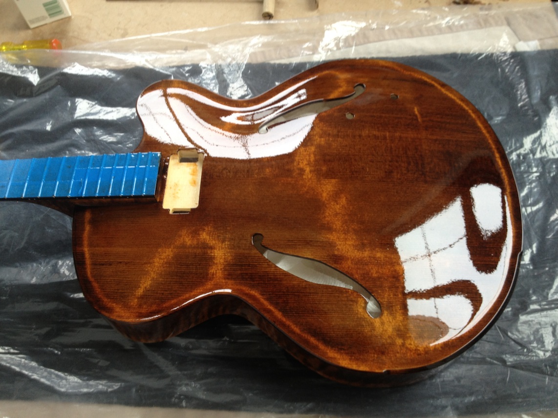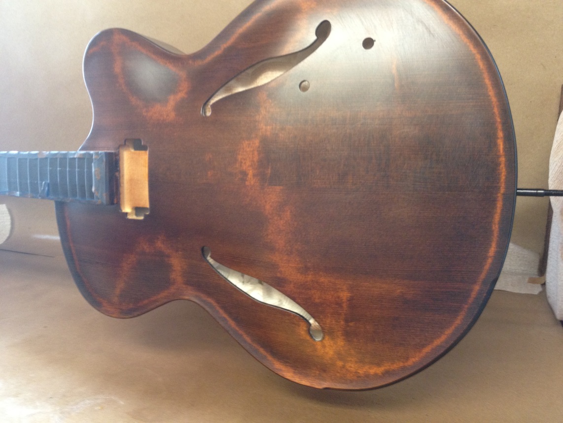 I’m using really fine European cello tonewood here throughout. During carving I ran into a hidden defect on Gilad’s backplate. We talked about it and decided to use it anyway instead of throwing it out. Some builders or players shy away from or reject defects like that but we decided not to argue with mother nature- it would look just fine with the earthy stain finish theme we picked. In fact I think it looks really beautiful! This wood grew in the forest for hundreds of years and i feel weird to just “throw it out”- see this video.